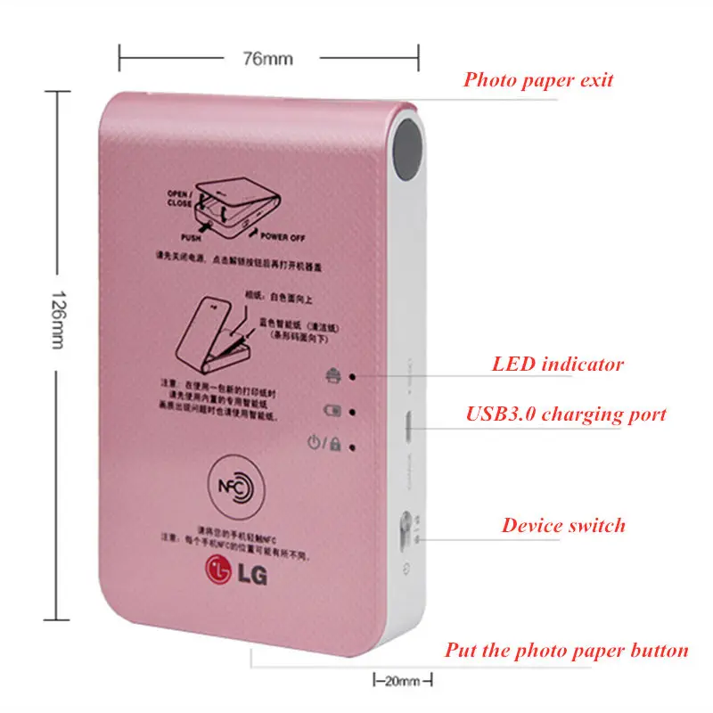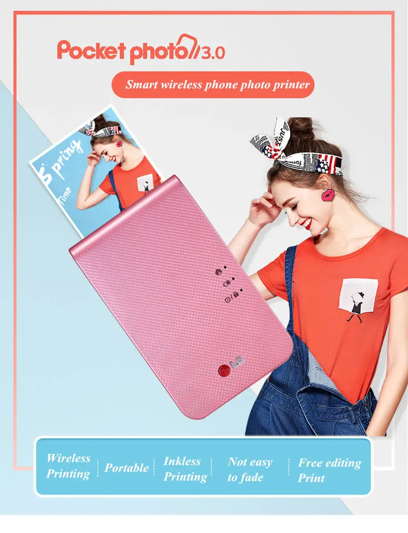 Материал: АБС-пластик Цвет: розовый, синий, белый Метод печати: беспроводная печать Интерфейс: Bluetooth Разрешение печати: 313DPI Размеры: 76*126*20 (мм) Диапазон толщины подложки: 76*126*20 (мм) Формат печати: 7,6*5 (мм) Цвет печати: цветная печать Скорость печати: 55 секунд Применимый материал: бумага