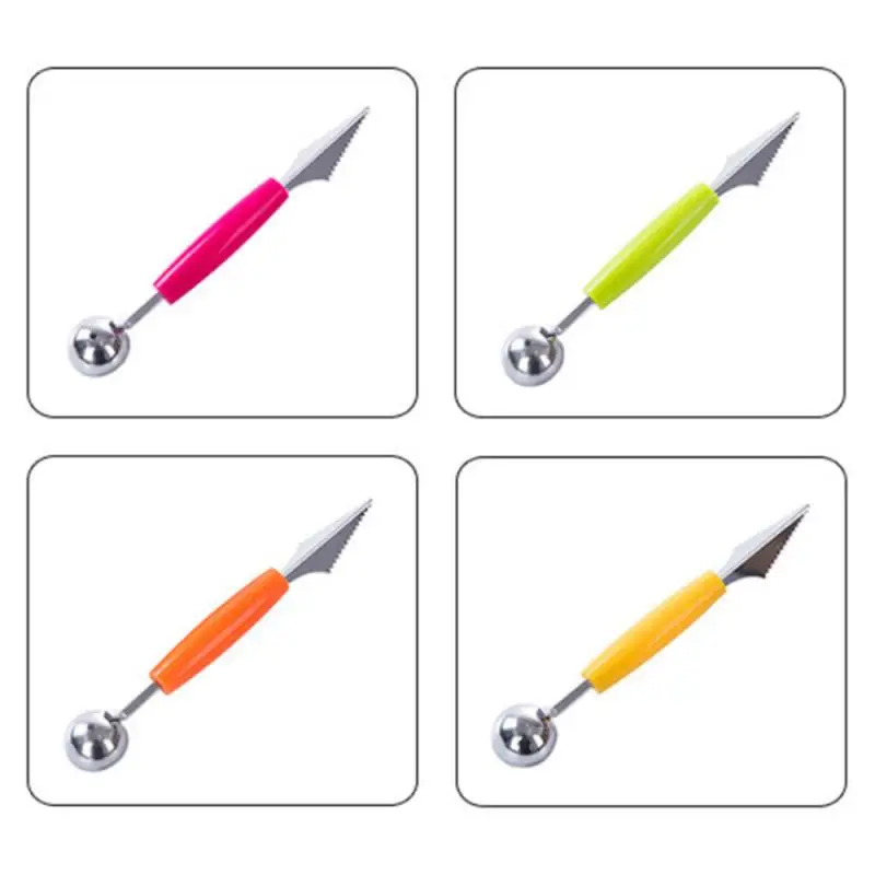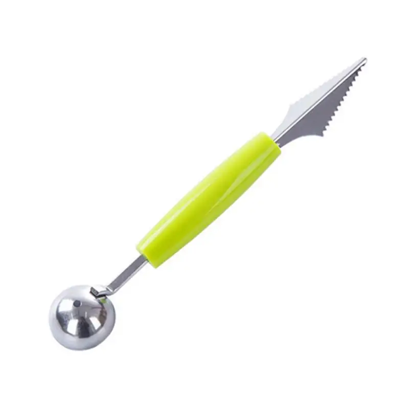 Многофункциональная конструкция с двумя головками, можно выкапывать сферические фруктовые шарики или круглые шарики для мороженого, один может легко отклеиваться, а другой-делать причудливую резьбу.