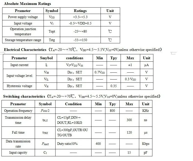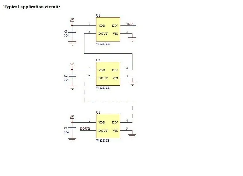 Протокол передачи данных использует один режим связи NZR. После сброса питания пикселя порт DIN получает данные от контроллера, первый пиксель собирает исходные данные 24 бит, затем отправляется во внутреннюю защелку данных, другие данные, которые изменяются с помощью внутренней схемы усиления сигнала, отправляются на следующий пиксельный каскад через порт DO. После передачи для каждого пикселя? Сигнал для уменьшения 24 бит. Pixel принимает технологию автоматической передачи resha-ping, что делает количество пикселя каскадом не ограничено передачей сигнала, зависит только от скорости передачи сигнала.