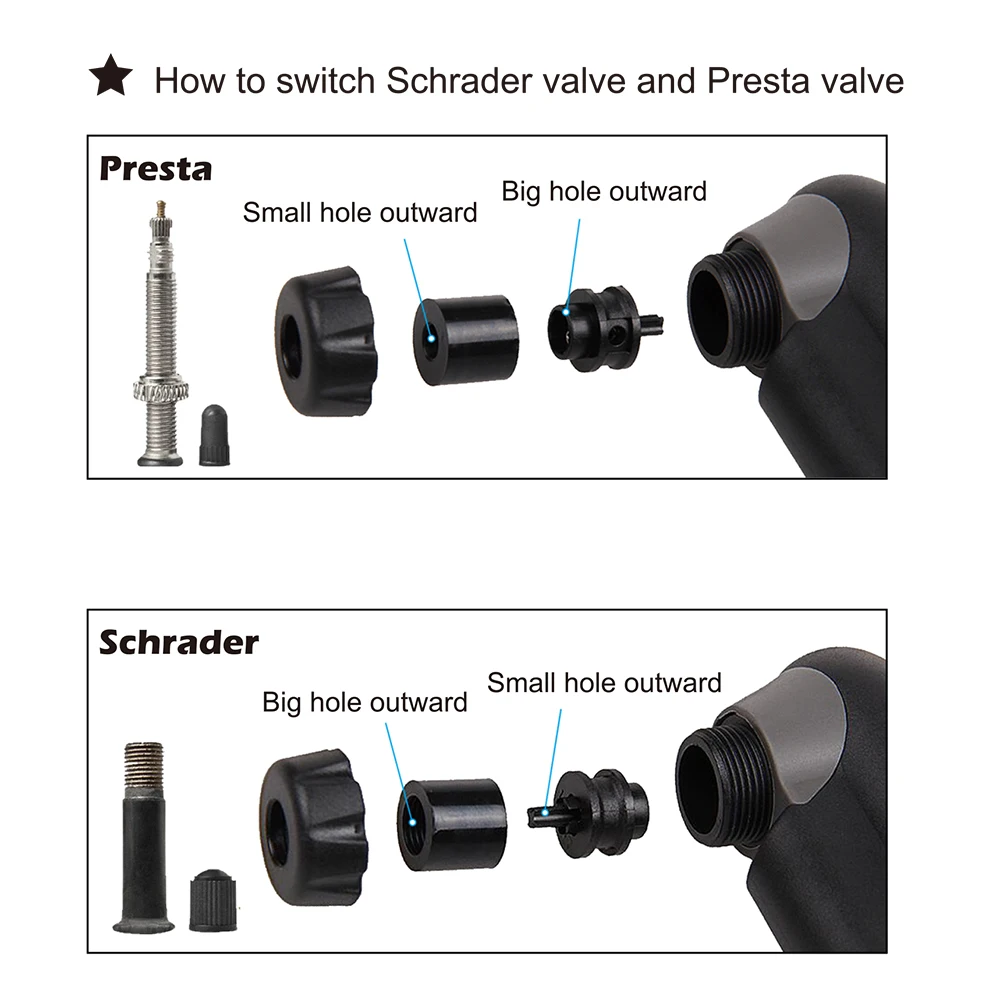 Нет необходимости в замене клапана: клапан насоса автоматически совместим как с клапаном Presta, так и с клапаном Schrader.