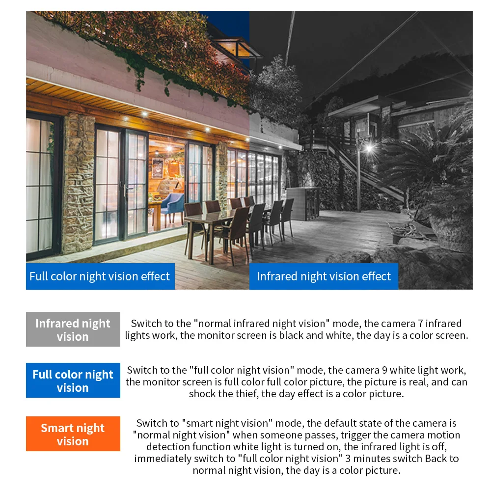 1. Инфракрасное Ночное Видение: Переключение на режим «нормальное инфракрасное ночное видение», инфракрасный светильник камеры работает, экран монитора черный и белый, дневной цветной экран 2. Полноцветное ночное видение: Переключение на режим «полноцветное ночное видение», белый светильник камеры работает, экран монитора-Полноцветное Изображение, изображение реальное и может шокировать вора, дневной эффект-это цвет 3. Умное ночное видение: Переключение в режим «полноцветное ночное видение», камера по умолчанию относится к «нормальному ночному видению», когда кто-то проходит, Функция обнаружения движения триггерной камеры, включен белый светильник, инфракрасный светильник немедленно отключается для "ночного видения полного цвета", 3 минуты выключены, чтобы переключиться на нормальное ночное видение, Дневной эффект-это цвет ПИР-сигнал тревоги: обнаружение движения (когда кто-то проходит, красный и синий светильник включится, и звуковой сигнал будет звучать, отпугивать вора и привлекать внимание) Аудио монитор: Встроенный пикап Двусторонняя Интерком: Поддержка голосового домофона Хранение: Поддержка карты памяти 8-128G (не входит в комплект) (Вставьте карту памяти после отключения питания)/Поддержка облачного хранилища Эффект ночного видения: инфракрасное ночное видение, полноцветное ночное видение, умное ночное видение Сетевой интерфейс: адаптивный порт Ethernet Рабочая температура: -40 °C ~ 70 °C