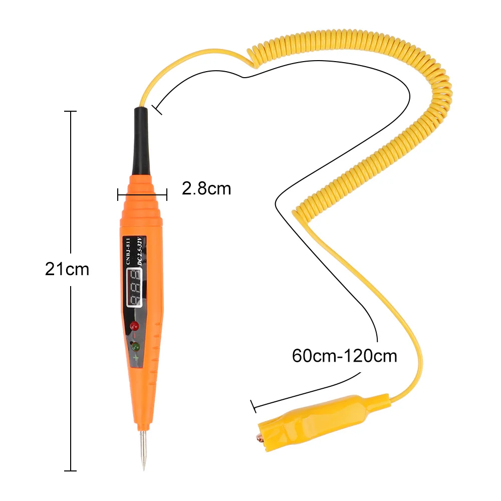 100% Новинка и высокое качество Он гибкий и не деформируется легко. Он прост в эксплуатации с помощью формы ручки. Цифровой дисплей позволяет видеть напряжение более четко. Тестовая головка иглы может быть удобно соединена с зажимом. Предназначен для обнаружения неисправностей цепи низкого напряжения в транспортной технике. Конструкция индикатора помогает обнаружить положительный и отрицательный полюса батареи или цепи. Поддержка испытания на короткое замыкание и открытое замыкание, проверка системы зажигания, проверка производительности двигателя, проверка системы зарядки, проверка производительности автомобильного аккумулятора, проверка полярности цепи. Он используется для автомобилей, мотоциклов, бульдозеров, роликов, экскаваторов и других операций по техническому обслуживанию транспортных самолетов.Посылка входит: