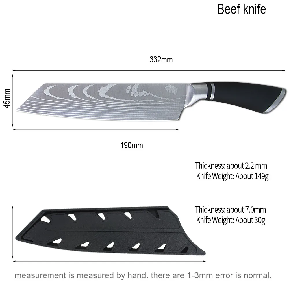 1. Лезвие общей длины: 8 "дюймов/190 мм 2. Твердость лезвия: более 58 - 60 HRC 3. Толщина лезвия: 2,2 мм 4. Материал: 4Cr13 нержавеющая сталь 440c 5. Стиль лезвия: высококачественное стальное лезвие + эргономичная матовая стальная ручка с покрытием