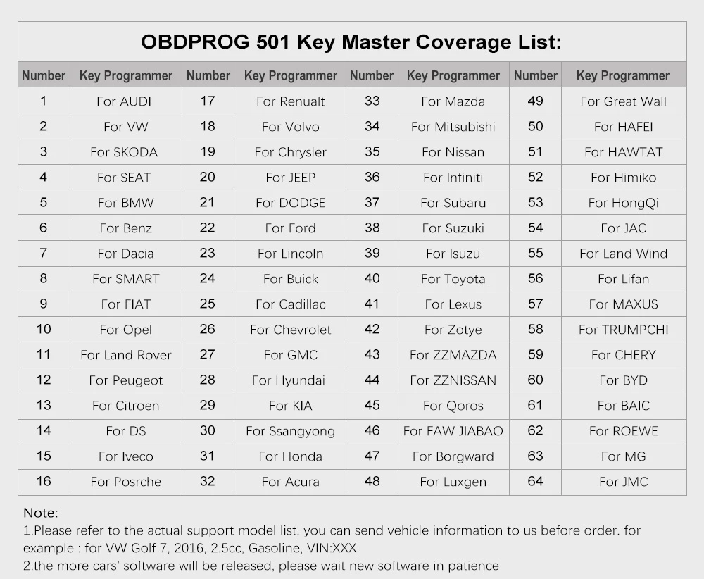 Европа: ForBMW, forBenz,forBorgward,forPeugeot,forCitroen, Броды, forDacia,forFiat,forJaguar,forLancia,forLand Rover,forOpel,forPorsche,forRenault,forSmart,forVolvo,forIveco,forVW/forAudi/forSkoda/forSeat Япония: ForHonda, forISUZU,forMazda,forMitsubishi,forNissan,forSubaru,forSuzuki,forToyota,forLexus Корея: ForHyundai, forKIA,forSsangyong Америка: Для FORD/для LINCOLN, для CHRYSLER, для GM, для Chevrolet, для Cadillac, для Jeep Dodge/ Китай (материк): ForBaic, forBesturn,forBisu,forBrilliance,forBYD,forChangan,forChanghe,forChery,forCowin,forDFFengshen,forDFFG,forDfliuzhou,Efornranger,forFoton,forGeely,forGreatwall,forHafei,forHanteng,forHawtai,forHimiko ForHongqi, forHuanghai,forJAC,forJiabao,forJMC,forLifan,forLufeng,forLuxgen,forMaxus,forQnlotus,forQoros,forRoewe,forSgmw,forSWN,forSOUTHEAST,forTJFAW,forTraum,forTrumpchi,forXenia,forYema,forZD,forZhongxing,forZotye, для Changfeng Примечание: 1. Не поддерживает люксовых брендов ключевой программирующий функция 2. Несмотря на то, что он совместим с большинством автомобилей, но различные регионы поддерживают список в разное время, или какая-то машина является специальным дизайном, таким образом, это может быть не совместим с некоторыми автомобиля, пожалуйста, оставьте нам сообщение и укажите ниже формат на электронную почту, и мы ответим в течение 8 часов. Например: для Audi A4 2005, 2.0cc дизельного топлива