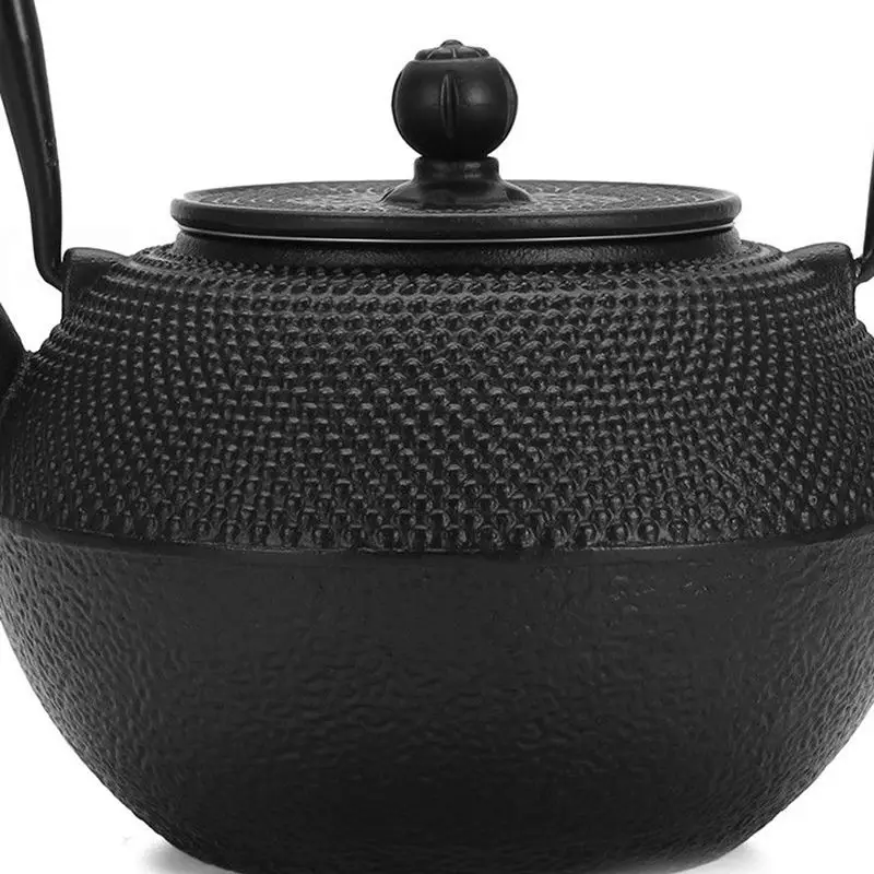 Железный чайник черного цвета, используемый для тушения, пивоварения и сервировки чая. Тяжелый железный материал сохраняет тепло чая настолько хорошо, что делает заправки еще горячими.