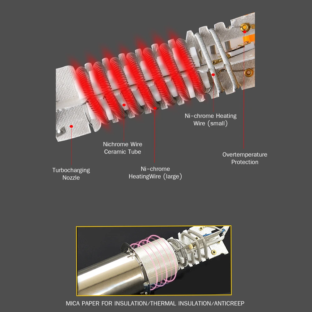 Мощный и эффективный Медный двигатель может нагревать воздух до 630 ℃ с переменной скоростью потока воздуха 250 л/мин или 500 л/мин.