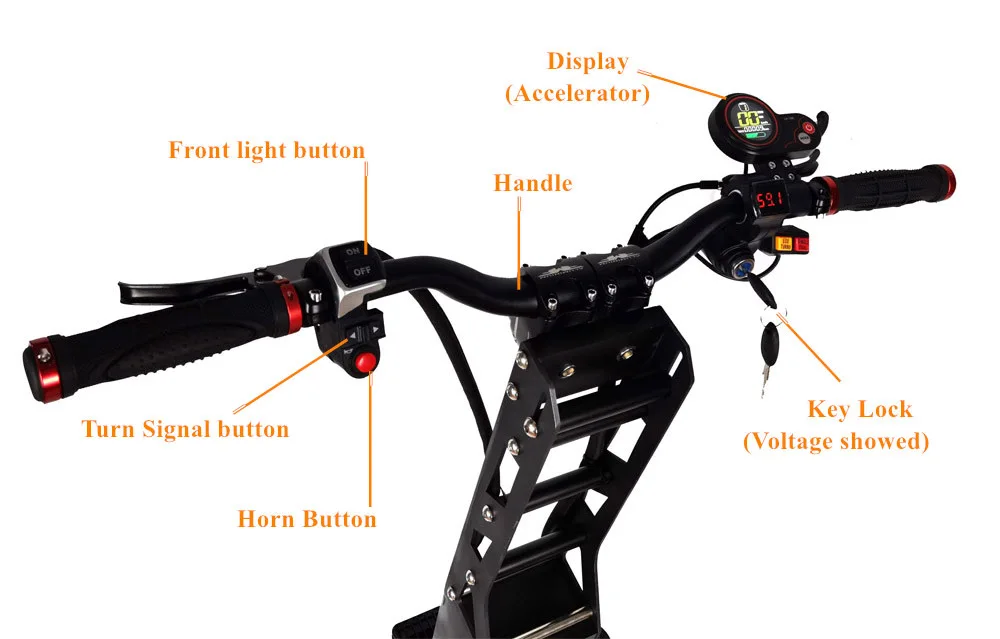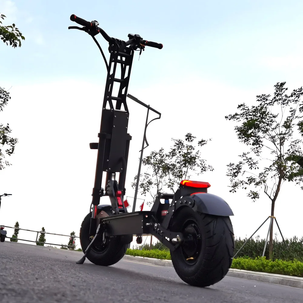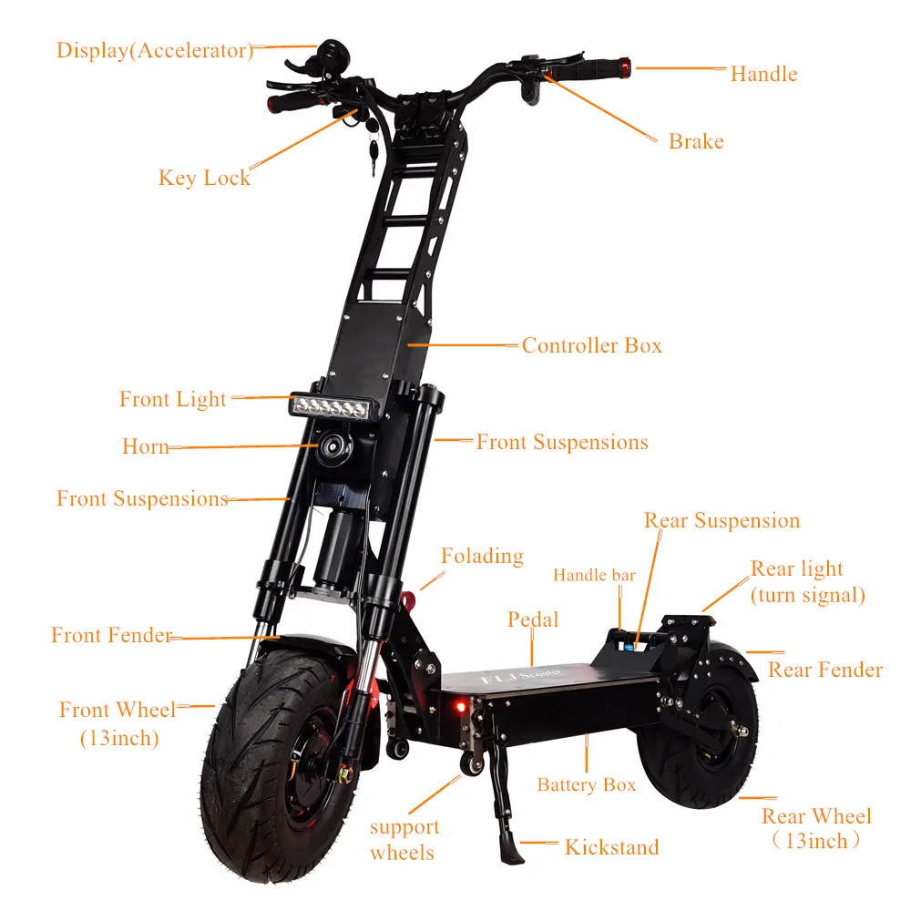 -Рама из алюминиевого сплава -- 13nch дорожные шины (бескамерная шина; Вакуумная шина) -- Максимальная нагрузка: около 180 кг -- Максимальная скорость около 85 км/ч (может ограничивать скорость 25 км/ч на передаче 1 + Кнопка TURBO) -- Блок контроллера в ручке -- С 2 зарядными устройствами -- Передние гидравлические подвесы...