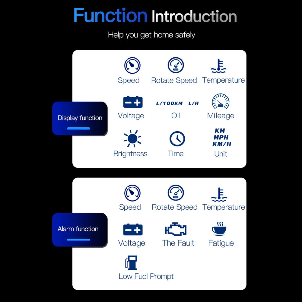 * 1. Скорость, масштаб, температура воды, напряжение, расход топлива, часы, одно расстояние преобразования, одно время преобразования, сигнал тревоги о превышении скорости, будильник о неисправности двигателя, устранение кода неисправности, будильник о температуре воды, масштабная сигнализация, напоминание о сдвиге, сигнализация напряжения, переключатель общественных миль, напоминание о усталости вождения, автоматическая и ручная регулировка яркости.