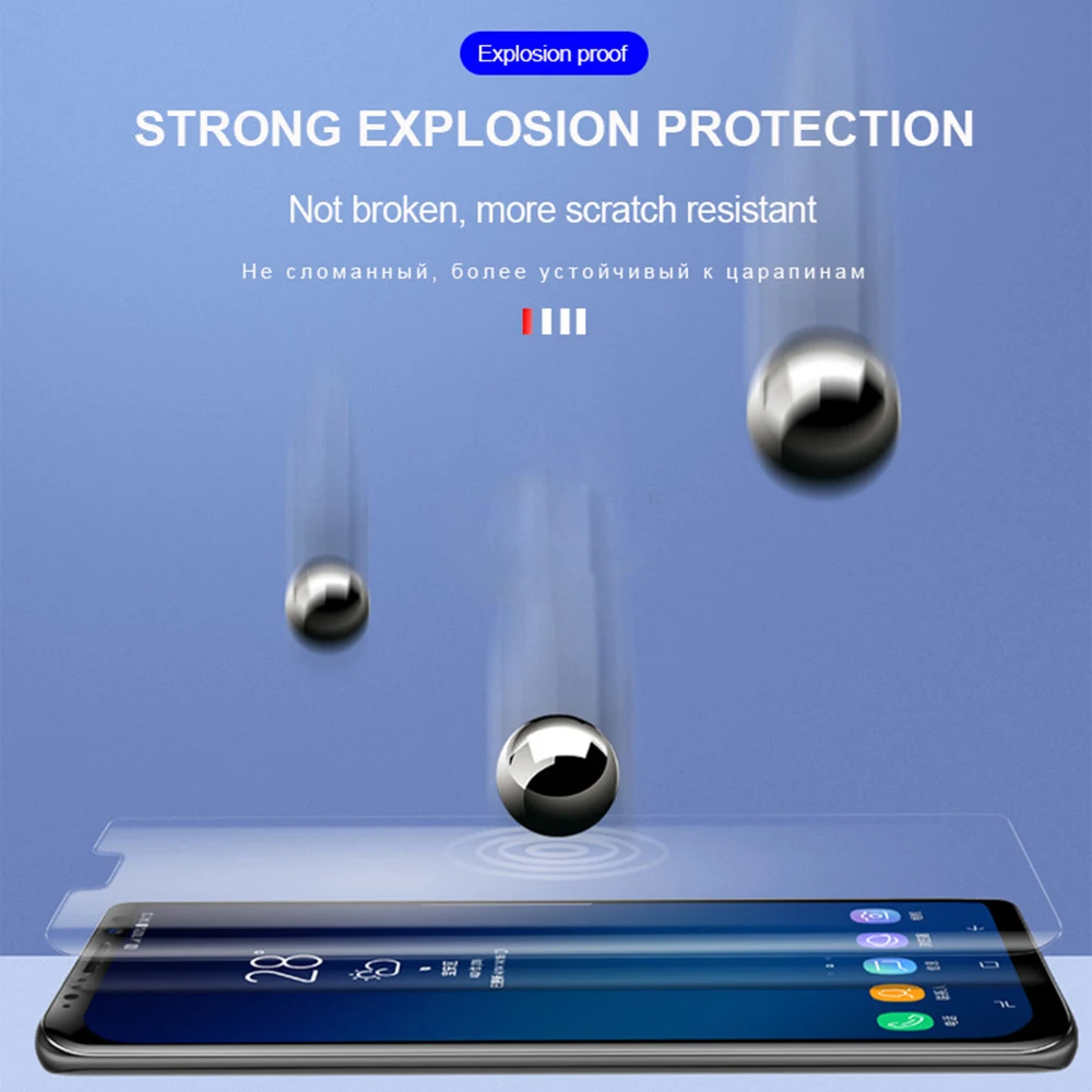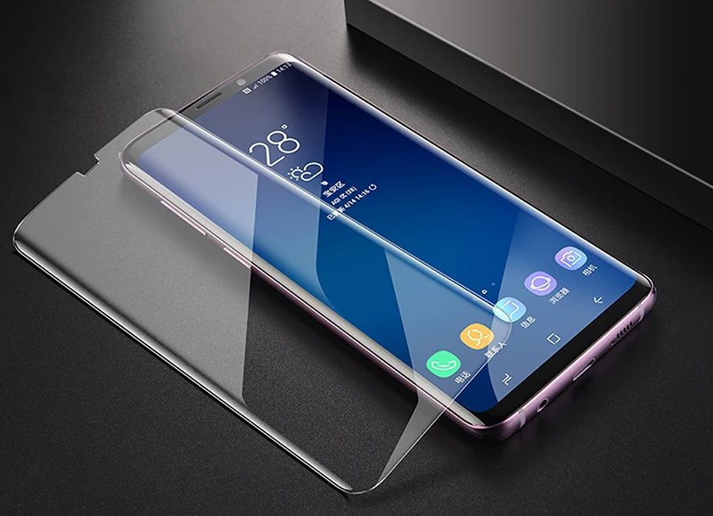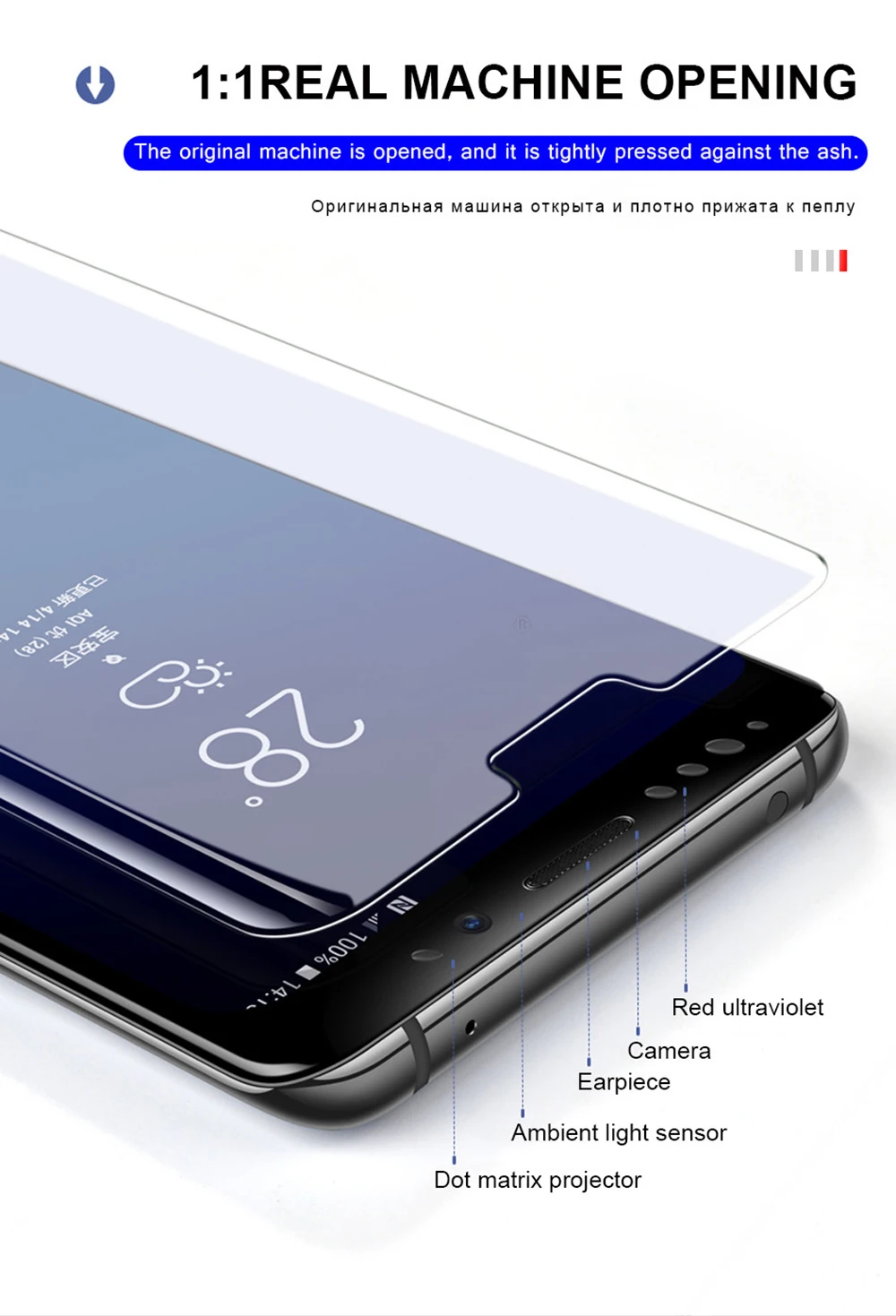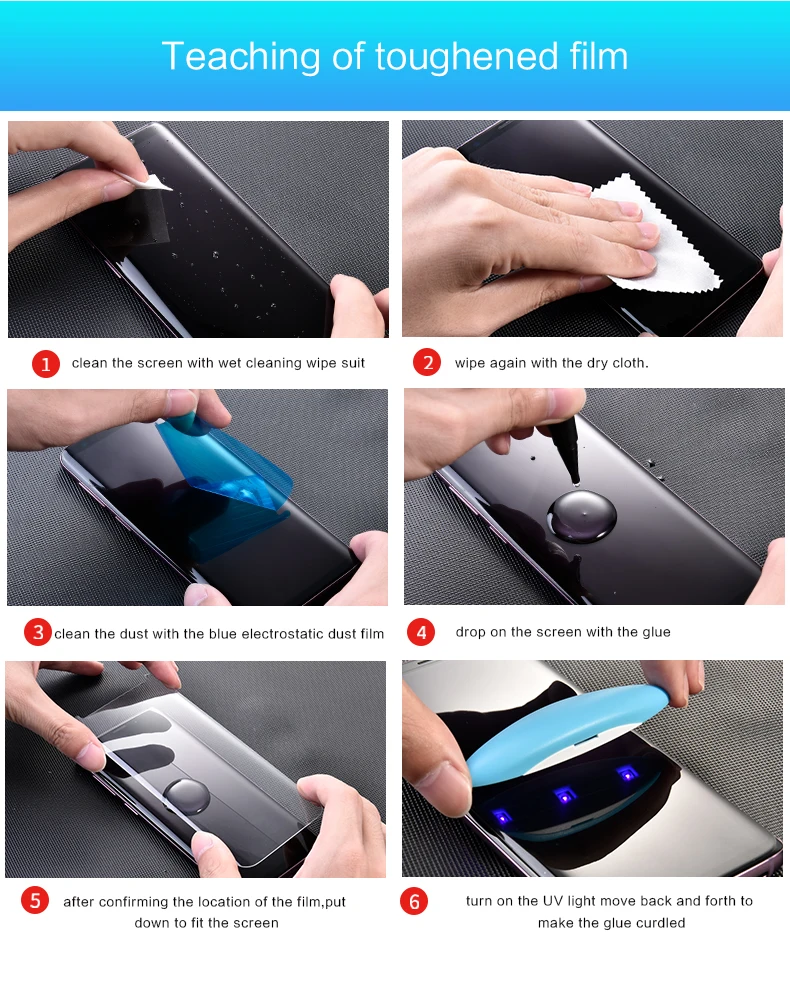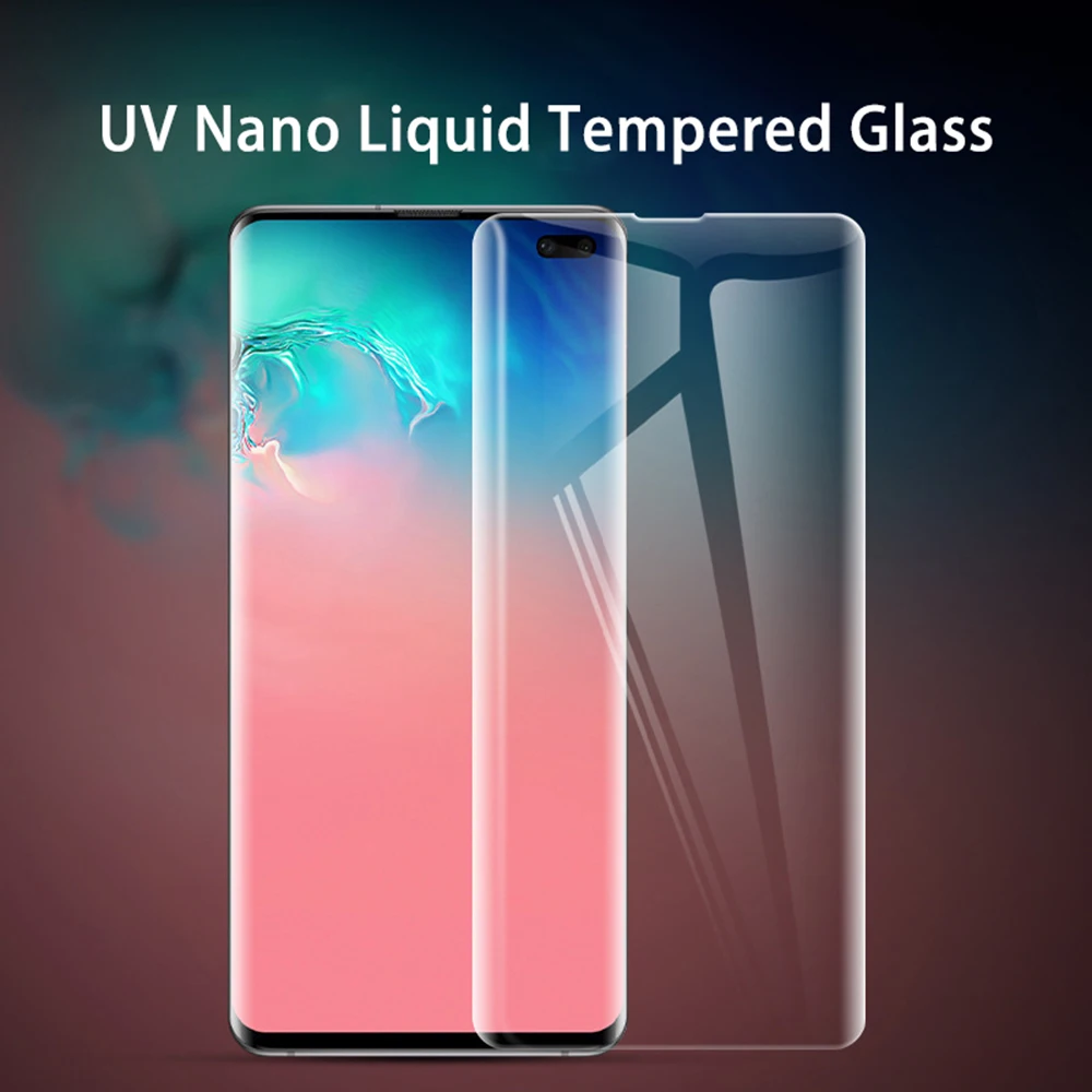 Защитное стекло, для Samsung S10e/S10 Plus/S9/S8/Note 8/9 Нановесы жидкий клей Curvy границы стекла протектор экрана Полное покрытие УФ Поддержка разблокировки отпечатков пальцев Особенности: Масляное покрытие против отпечатков пальцев Твердость поверхности 9H Тонкое закаленное стекло 0,33 мм Антиразбитая стеклянная пленка Наномасштабные оптические клеи полностью адсорбируются Посылка включает в себя: 1 * закаленное стекло 1 * жидкий клей 1 * УФ-светильник 1 * инструменты для установки