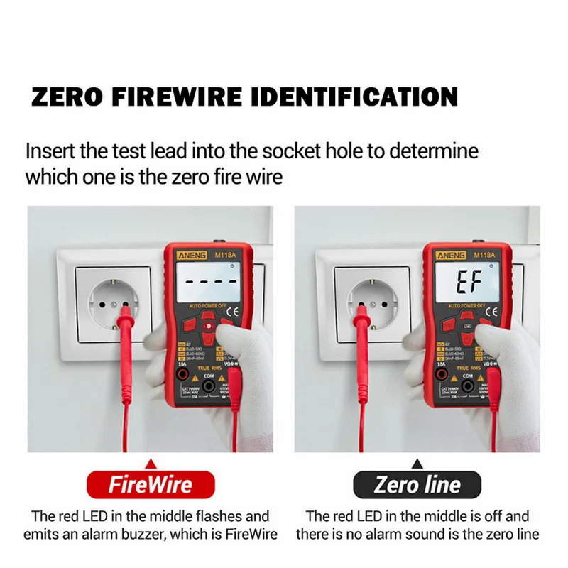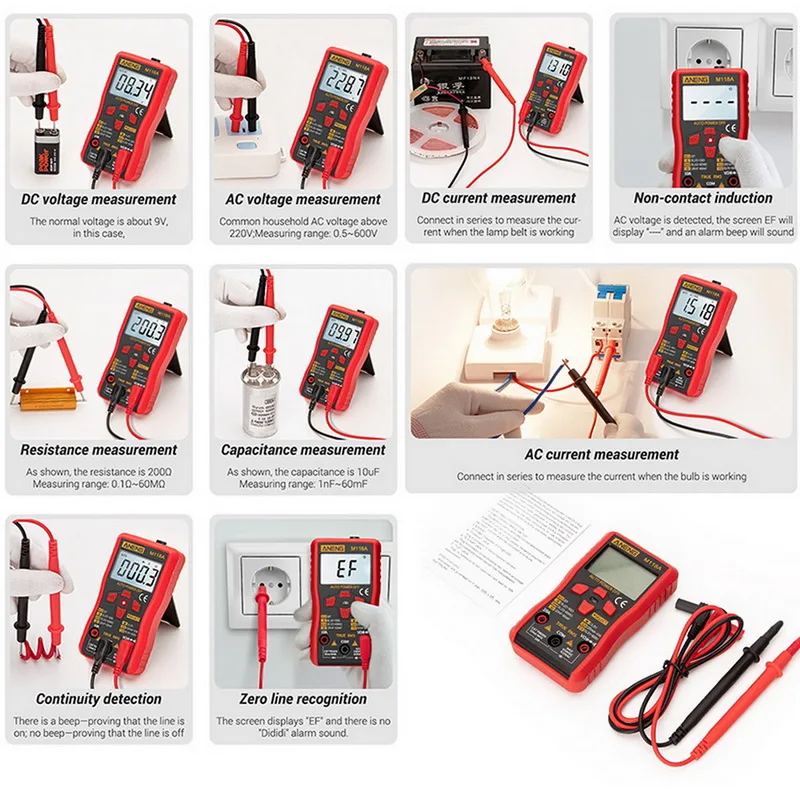 ** Многофункциональность: Широкий диапазон испытаний для переменного/постоянного напряжения, переменного/постоянного тока, сопротивления, непрерывности, емкости, тестовых диодов, нулевого провода и живого провода.