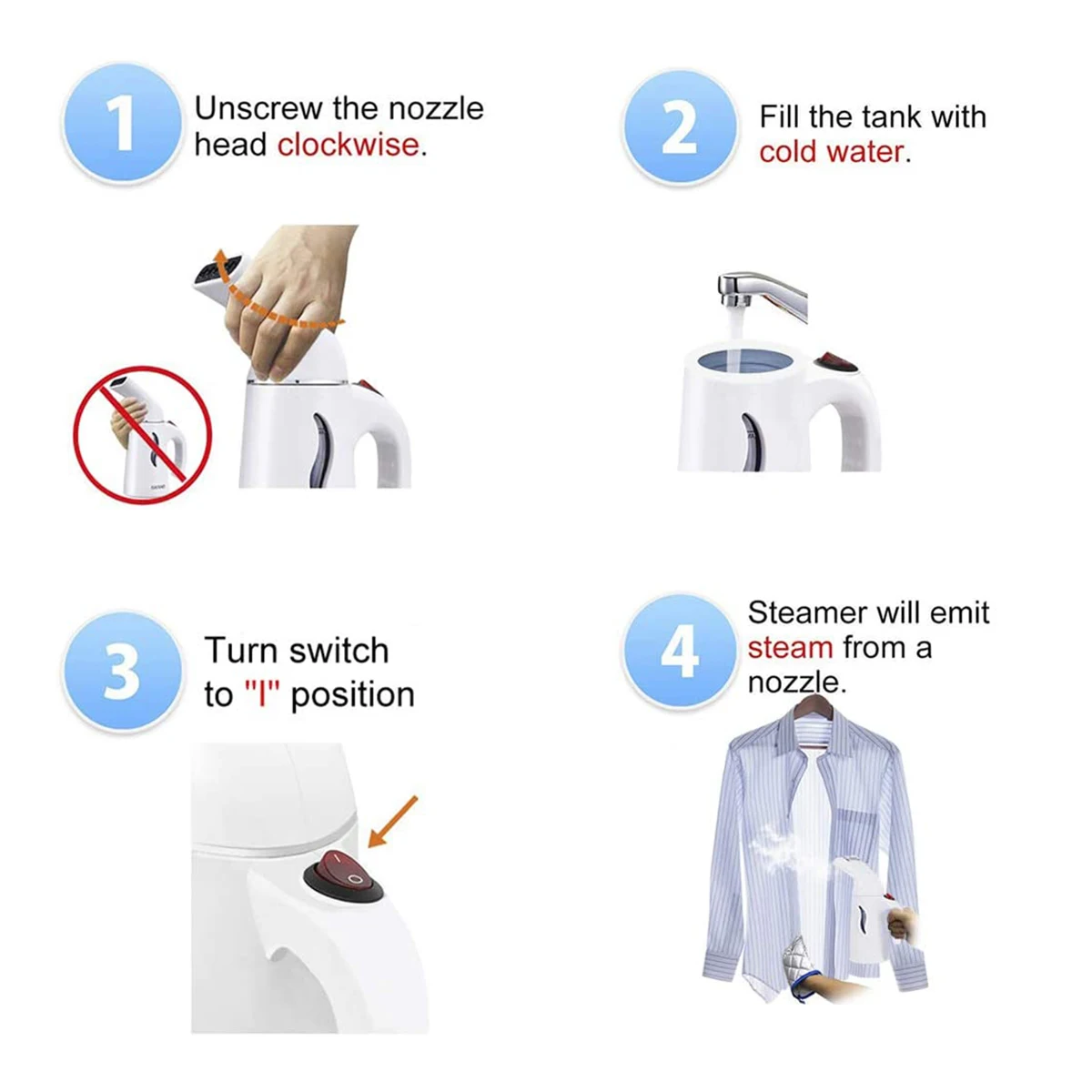 1. Отвинтите насадку сопла, наполните резервуар водой до нужного уровня. Никогда не превосходите максимальный уровень. Когда вы закончите наполнение, закройте головку. 2. Включите/выключите переключатель в положение ON. Светильник переключателя указывает на то, что отпариватель включен. Отпариватель выделит пар из сопла в течение 2 минут. 3. Ваш дорожный отпариватель для одежды имеет функцию сброса. Когда соединить Русь из воды, пожалуйста, выключите пароход вовремя. 4. Когда вы закончите с вашим сеансом парения, поместите Переключатель ВКЛ/ВЫКЛ в положение ВЫКЛ и удалите вилку из розетки.