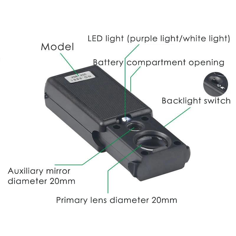 <Яркий светодиодный и УФ-светильник: с источником светодиодный светильник, вы можете четко видеть предметы в темноте или в низкий светильник. УФ-Светильник обеспечивает детектор для обнаружения фальшивых банкнот, которые используются для банкнот, паспортов, кредитных карт, дорожных чеков и т. Д.