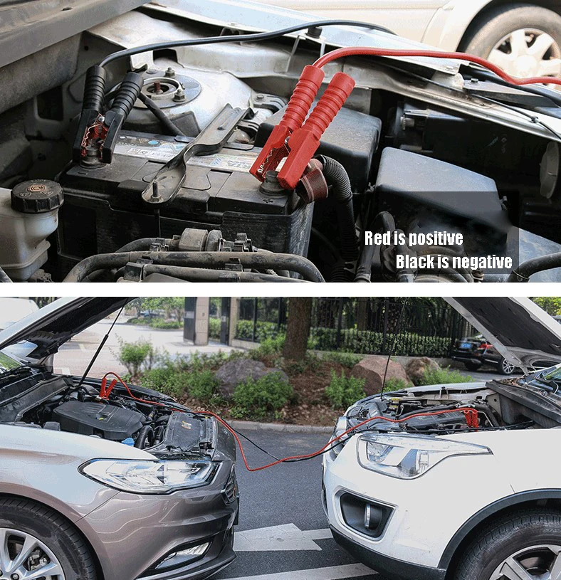 1. Во-первых, прижмите красный провод к положительному электроду батареи «спасенного транспортного средства» +.2. Прижмите другой конец Красного провода к положительному электроду батареи «спасательного транспортного средства» +.3. Прижмите черный провод к отрицательному электроду "Спасенный автомобиль" Аккумулятор.-4. Прижмите другой конец черного провода к отрицательному полюсу "Спасательная машина" -5. Запуск двигателя "спасательное транспортное средство".6. Наконец, начните" Спасенный автомобиль" Двигатель.Вариант 1: длина 3 м, диаметр проволоки 10 мм, подходит для транспортных средств с перемещением ниже 3.0л.