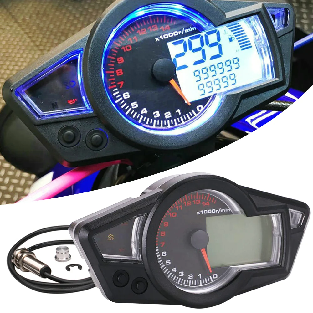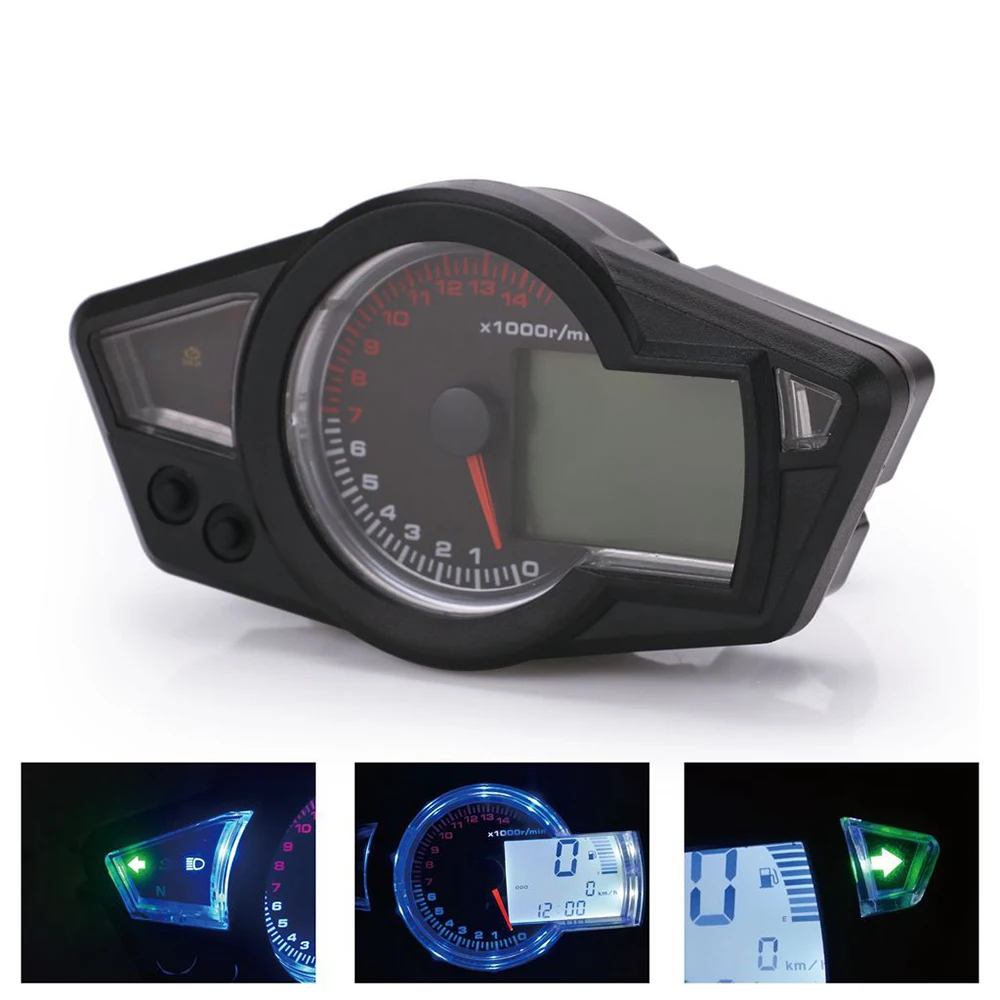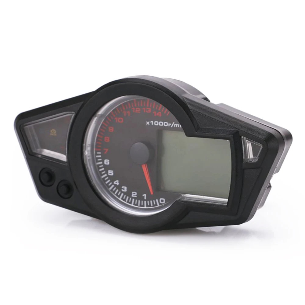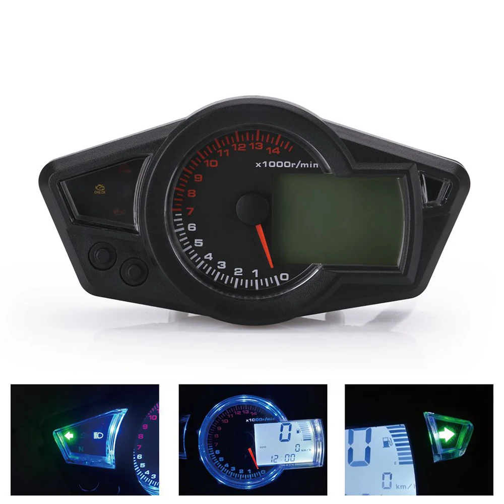 Этот продукт является Многофункциональным Цифровым ЖК-спидометром для мотоцикла. Включая цифровой дисплей спидометра, дисплей одометра, тахометр дисплей, само лампа проверки, дисплей уровня топлива, левый и правый индикатор, N шестерня, батарея, индикатор температуры воды.