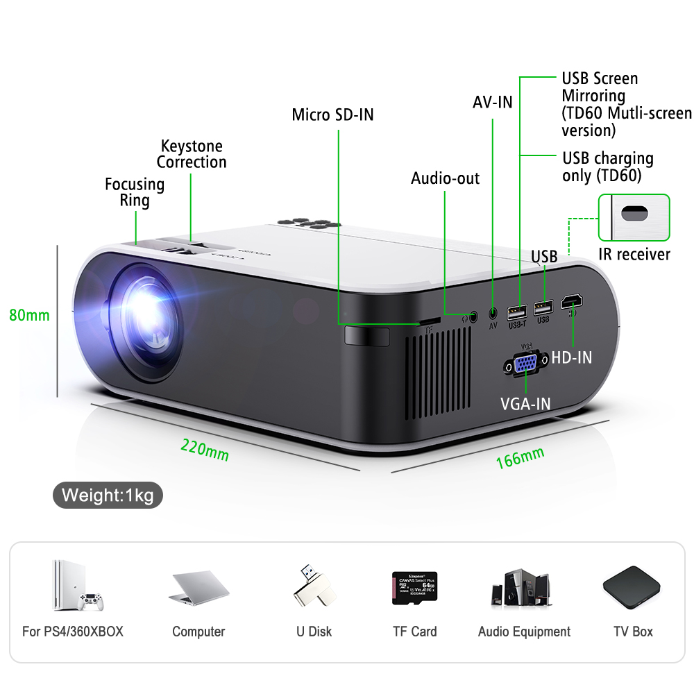 Улучшенный проектор TD60 может обеспечивать более яркие цветные изображения, чем другие миниатюрные проекторы, тем самым улучшая общее качество изображения.