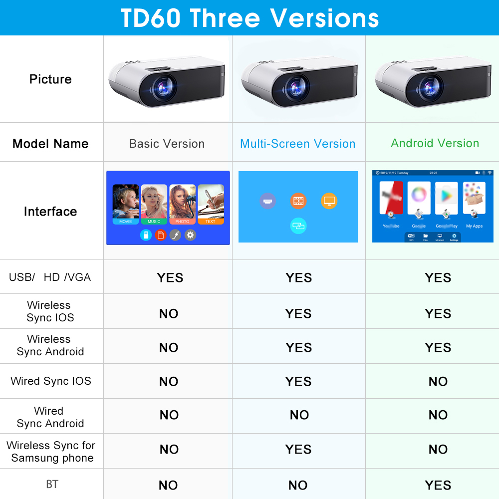 1) TD60 Android версия поддерживает Miracast , Airbin контакт с телефоном 2) Multi-screen версия TD60 поддерживает беспроводной и проводной контакт с телефоном