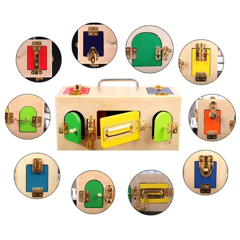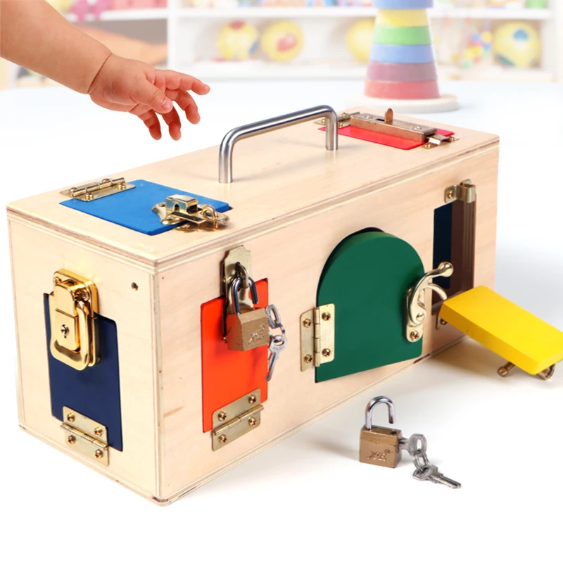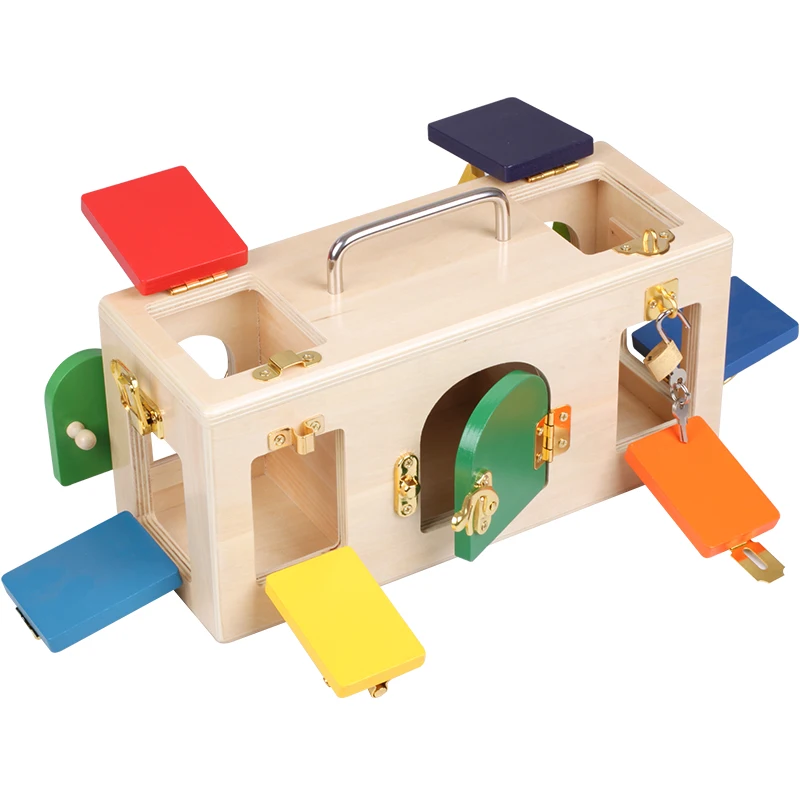 An elaborate wooden lock box with many locks, doors and latches