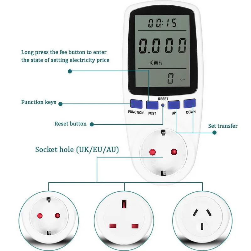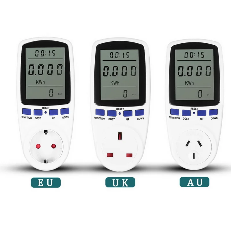 <Различные параметры: Мощность (Вт), напряжение, ампер, идеально подходит для контроля потребления энергии бытовой техники.