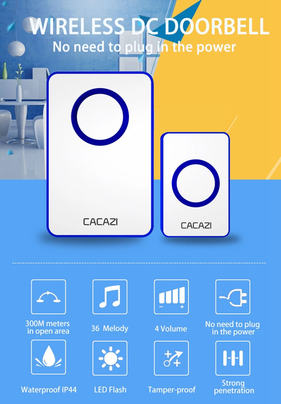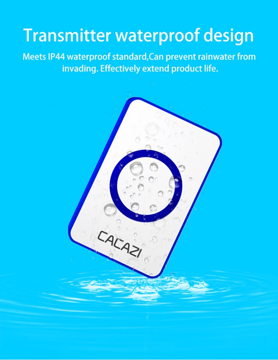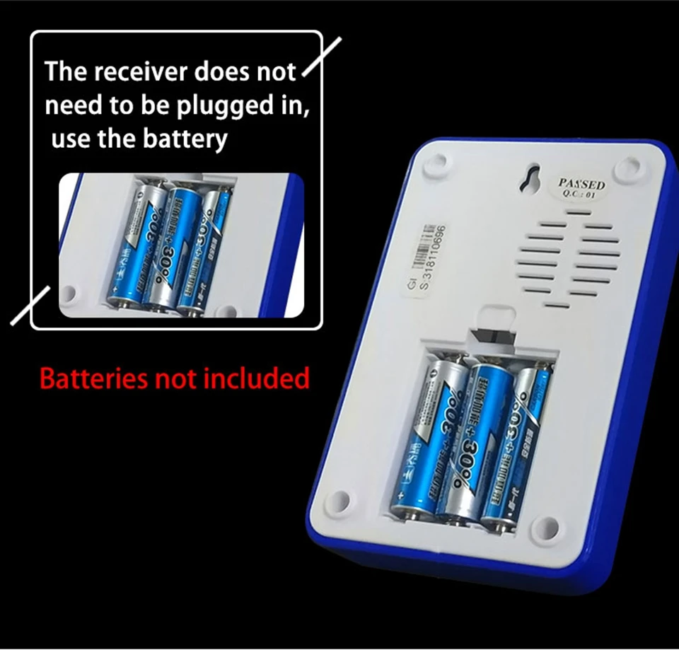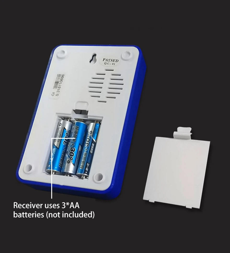 1. Нажмите кнопку, супер код обучения может свободно узнать, чтобы соответствовать, может быть неограниченное соответствие приемника и кнопки. 2. Передатчик без винтового патрона для достижения водонепроницаемости и пыленепроницаемости. 3. Передатчик использует щелочную батарею 23A12V (не входит в комплект). 4. Приемник использует 3 щелочные батареи AA, нет необходимости подключать блок питания, и аккумулятор может быть использован. (не включает батарею). 5. Дальность приема: 120 м на открытой местности. 6. На беспроводной сигнал будут влиять препятствия. Чем больше препятствий, тем тяжелее потеря сигнала. 7. Приемник имеет 4 уровня 20-80 дБ, 36 музыки на выбор. 8. Размер передатчика: 80*46*19 мм 9. Размер приемника: 140*91*28,5 мм 10. Приемник можно повесить на стену или разместить на столе, в любом месте, кнопочный передатчик можно приклеить его к двери с помощью клейких лент. Примечание: Кнопка не может быть размещена на железной двери, потому что это будет мешать сигналу. Если приемник не звонит при нажатии на кнопку после получения дверного звонка, пожалуйста, проверьте шаги: 1. Пожалуйста, подтвердите, имеет ли кнопка установленную щелочную батарею 23a12в. 2. Проверьте, имеется ли в приемнике 3 * AA щелочная батарея. 3. Пожалуйста, соедините дверной звонок снова.