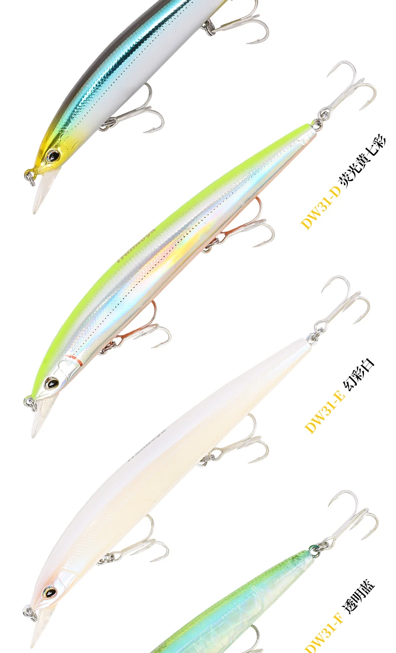 Name: TSURINOYA DW31 Floating Minnow Jerkbait Type: Minnow Hard Lure Length: 129mm Weight: 14.8g Action: Floating Water Diving Depth: 1m Hook: 6063-3X-CP Color: 6 Colors Available