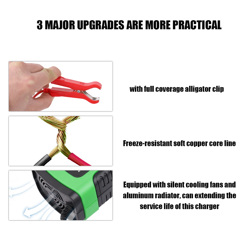 Надежное качество: трансформатор из чистой меди имеет высокую мощность и стабильную мощность для быстрой зарядки аккумулятора. А материал АБС огнестойкий, изоляционный и термостойкий.