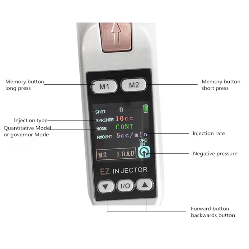Питание: батарея Встроенный литий-полимерный аккумулятор для зарядки (7,4 V, 850 мА · ч) Зарядное устройство: Адаптер Вход: 110 ~ 240V 50/60 Гц Выход: DC 8,4 V 500mA максимальная продолжительность времени: использование отрицательное давление до 2000 раз. Потребляемая мощность: 4 Вт Материал: ABS (основная машина, ручка отрицательного давления, Зарядная база), PC (держатель шприца, фильтр), никелированный (поршень шприца), силиконовая трубка (отрицательное давление трубка) ЖК-дисплей: 1,5 дюймовый цветной OLED мощность работы: кнопка включения или без Автоматическое отключение через 5 минут. Режим: непрерывный, установка инъекции дозы: 5 уровней (непрерывный), 6 уровней (доза) Weihgt: основной корпус 220 г (включая держатель шприца), ручка отрицательного давления 100 г Размер: 153x38x38 мм (основной корпус), 170x70x48 мм (ручка отрицательного давления)