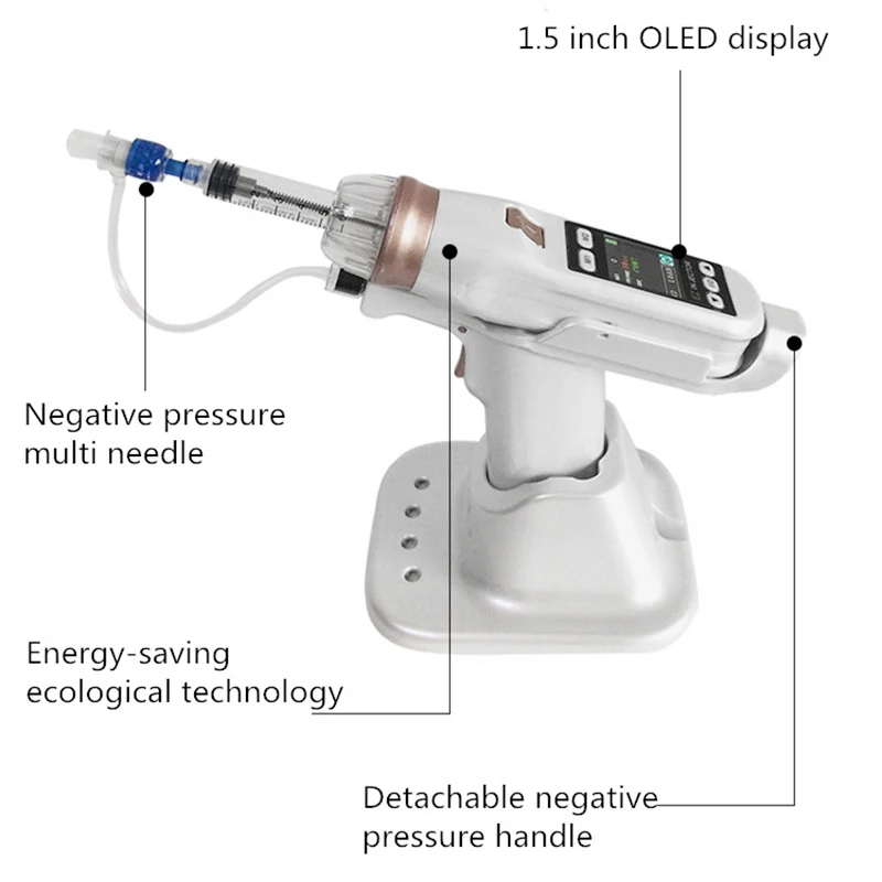 --- Применение для эндогенной и экзогенной инъекции --- технология инъекций, которая может ускорить процесс обработки --- простота в эксплуатации, отсутствие побочных эффектов, но значительный эффект --- Регулируемая глубина инъекции, дозы, скорость и интенсивность всасывания. --- Технология защиты от обратного потока для лекарств и крови. ---- Стимулирует кожу для самозаживления, способствует метаболизму кожи