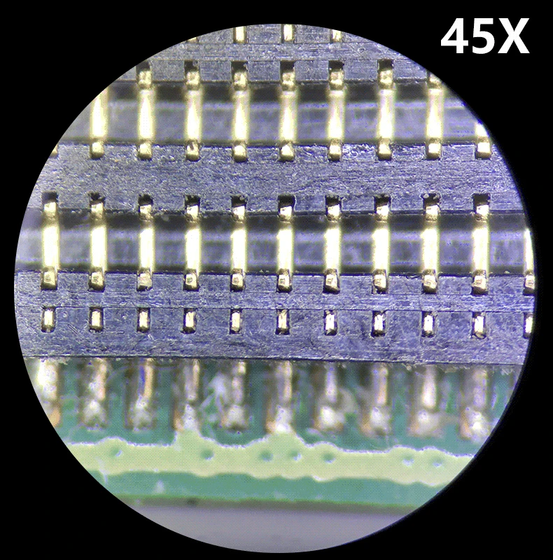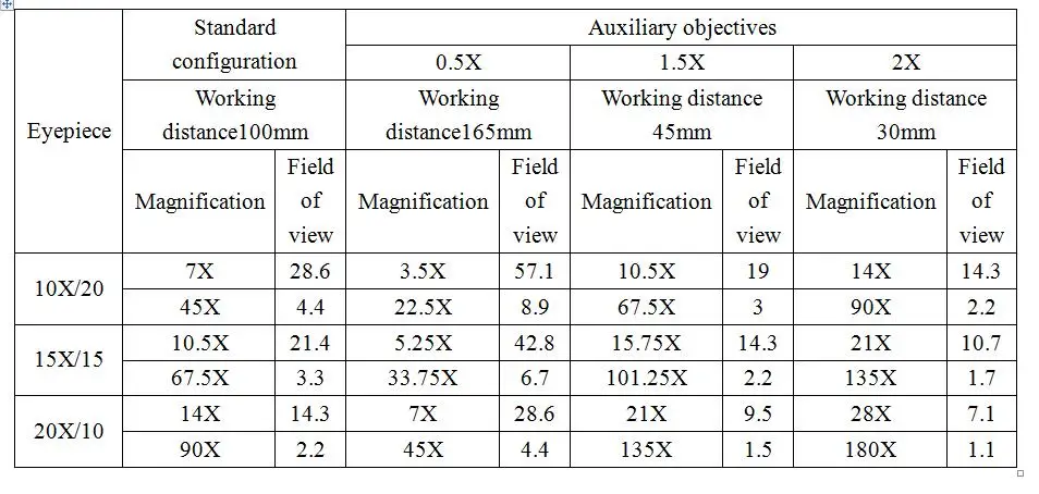 Рабочее расстояние: 7X-45X (100 мм) использование объектива 0.5x 3.5X-45X(165 мм) использование 2. Объектив 0x 7X-90X(40 мм)
