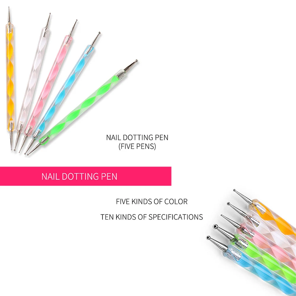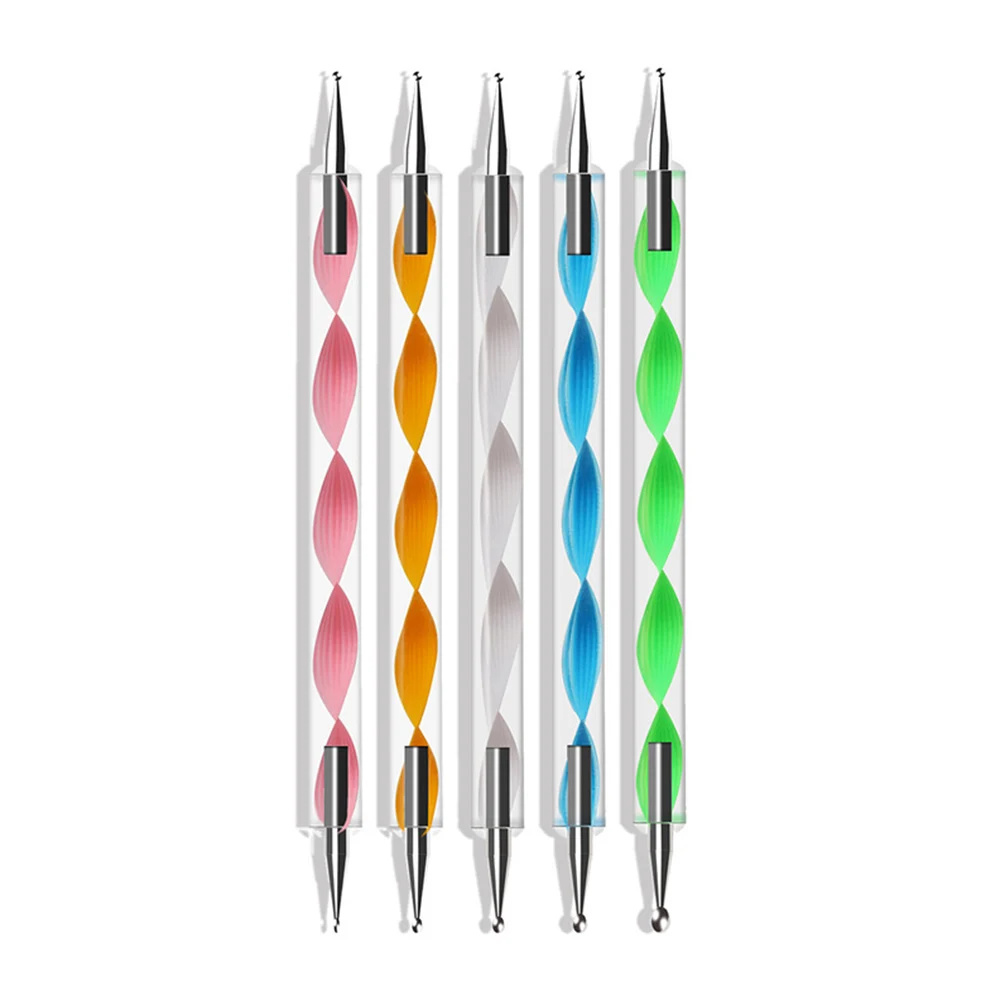 Существует 5 типов двухсторонних ручек 10 размеров, которые используются для рисования точек на ногтях. Подходит для пирсинга натуральных или акриловых ногтей, камней мандалы, полимерной глины и т. д. также подходит для смешивания швов и выбивания узоров в глине.