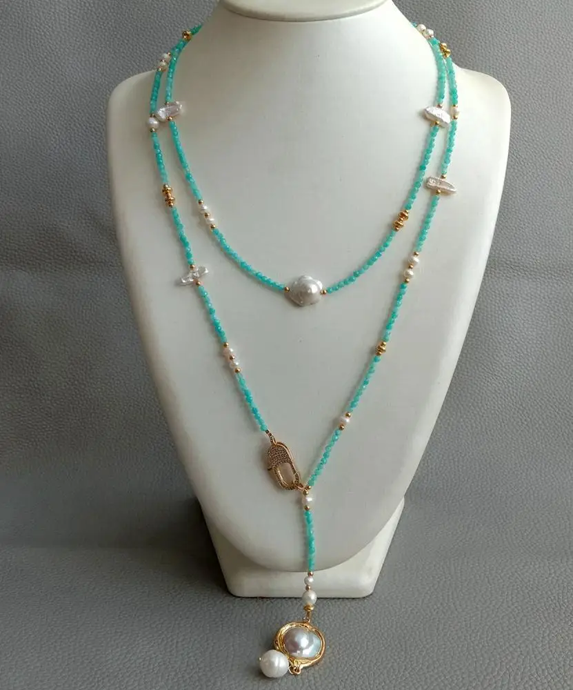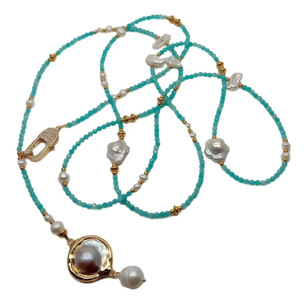 Информация о драгоценных камнями: Пресноводный Культивированный жемчуг, белый многообразный жемчуг Кеши, белый жемчуг, натуральный синий перуанский Амазонит, хорошее качество, высокий блеск!