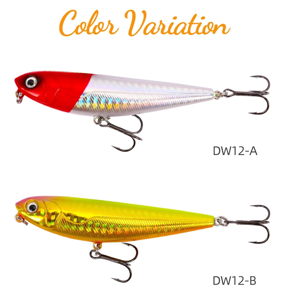 Информация о продукте: 1. Название: TSURINOYA Top Water Hard Lure DW12 2. Вес: 10 г 3. Длина: 85 мм 4. Цвет: 8 цветов 5. Тип: плавающая приманка-карандаш 6. Глубина: верхняя вода 7. Крючки: фирменные крючки 8. Посылка: индивидуальная упаковка