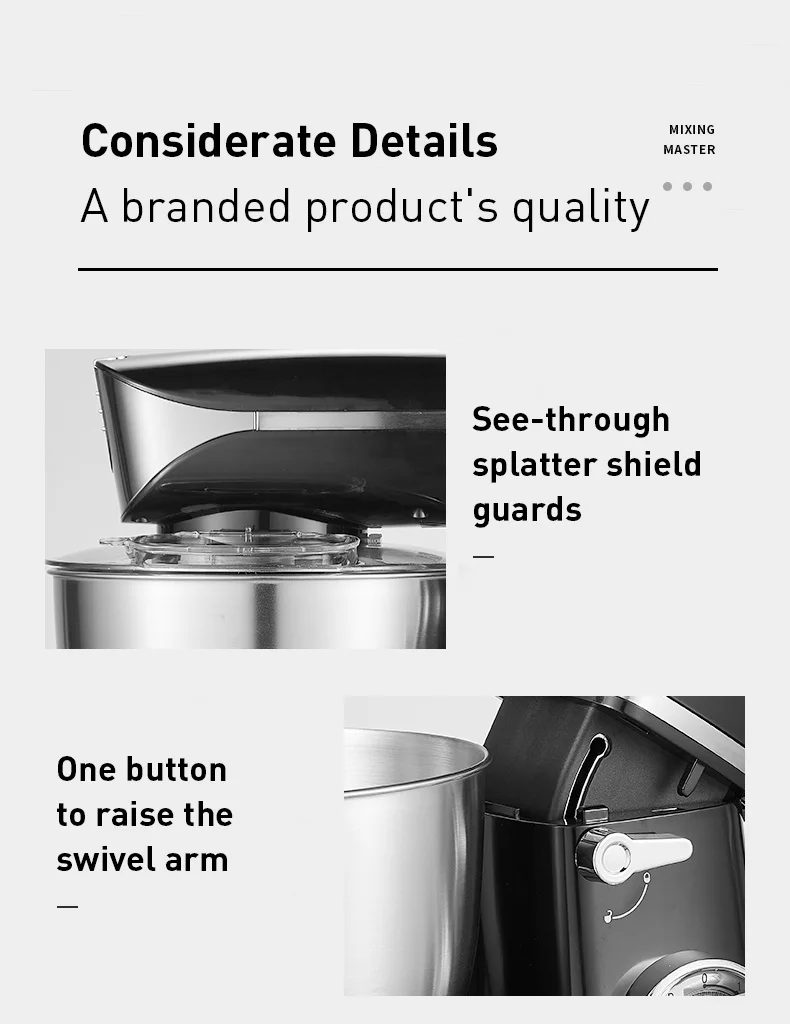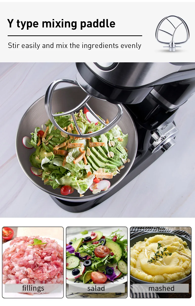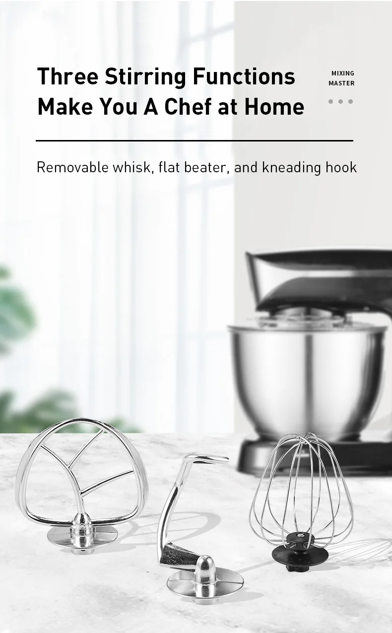 Крючок для теста, плоская тарелка и венчик: с 3 различными насадками (тесто-крючок, биратель, венчик), он идеально подходит для вас, чтобы сделать все виды смешивания пищи, включая creaming, смешивание, биение, взбивание, разминание. Теперь вы можете сделать множество новых рецептов, от пирожных, печенья до хлеба.