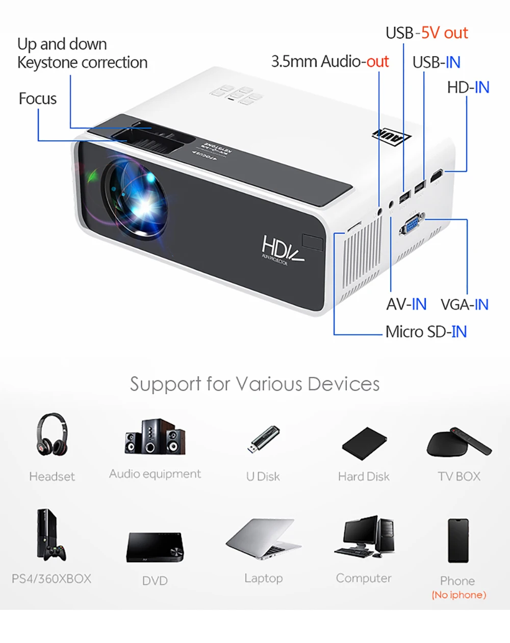 Поставляется с портами HDMI, USB, VGA,SD, AV, Audio, TV и SD, практически все устройства, которые обычно используются, могут работать с. Вы можете выбрать подключение к телевизору, телефону, звуку, ноутбуку и т. д.