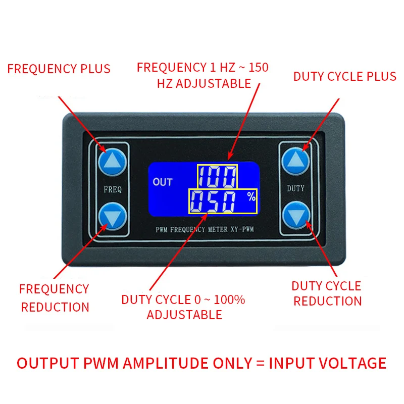 ** Настройка: в модуле есть 4 независимых кнопки для настройки значения частоты и значения рабочего цикла.