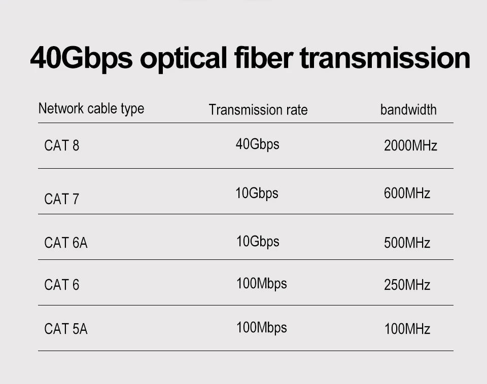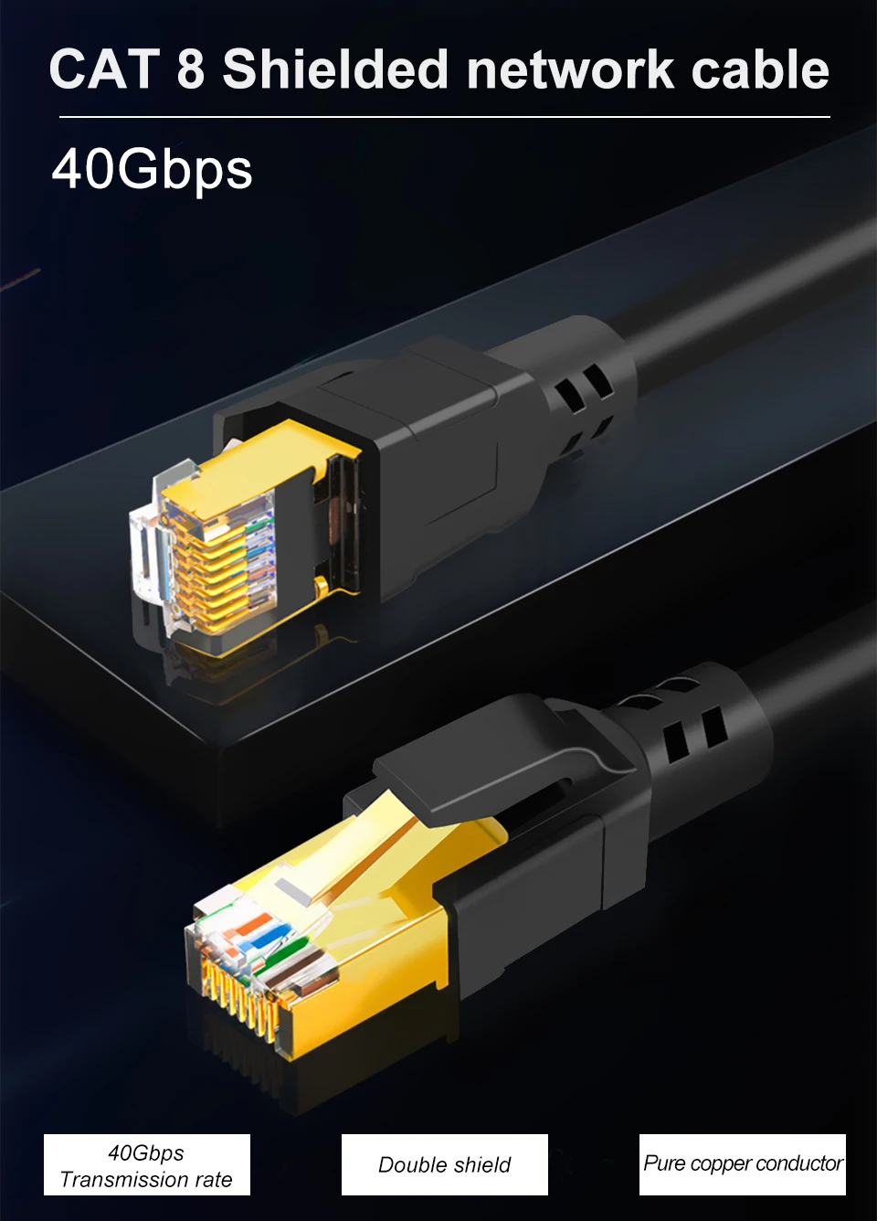 Cat8 Ethernet кабель: поддерживает пропускную способность до 2000 МГц, обеспечивает максимальную скорость сети при 40 Гбит/с для серфинга в Интернете, потокового видео, музыки, И другие данные без проблем медленной сети.