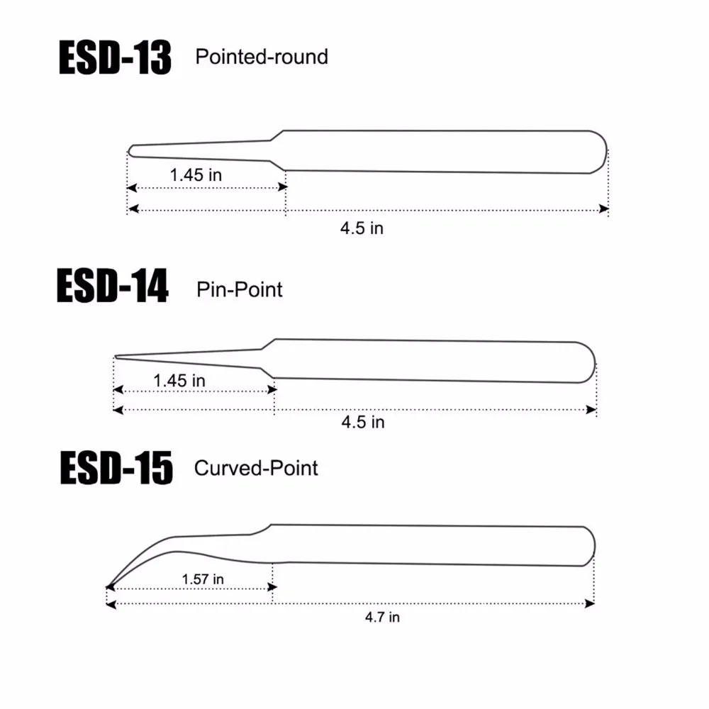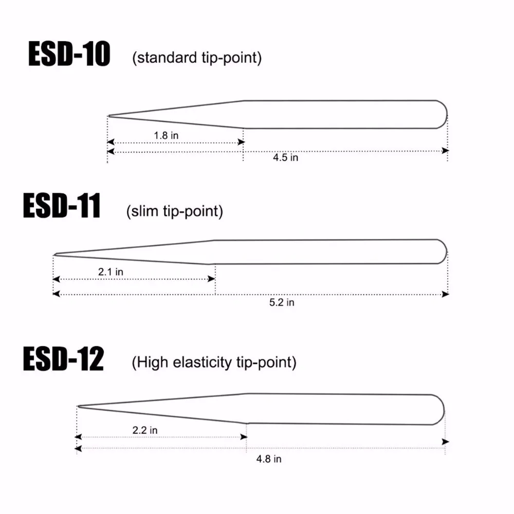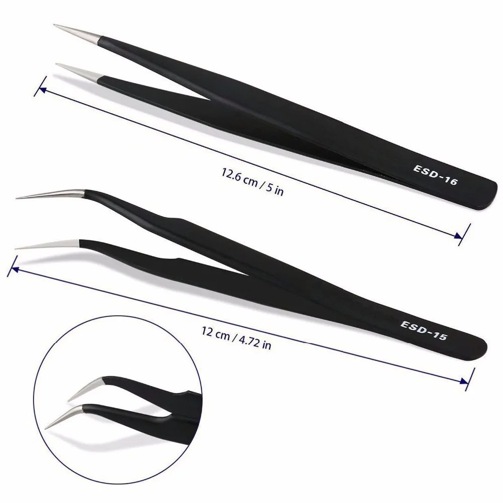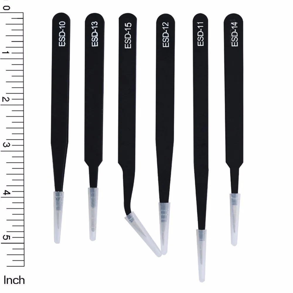 NCLUDING 9 шт точный пинцет-Размер: ESD-10: Антистатический (123 мм); ESD-11: верхний и прямой тонкий наконечник (141 мм); ESD-12: прямой тонкий наконечник (134 мм); ESD-13: тонкий и круглый (122 мм); ESD-14: прямой тонкий наконечник (121 мм); ESD-15: изогнутый тонкий наконечник (120 мм); ESD-16: прямой тонкий наконечник (125 мм); ESD-17: изогнутый тонкий наконечник (122 мм); ESD-34A: квадратный наконечник с острым носком высокого веса (119 мм).