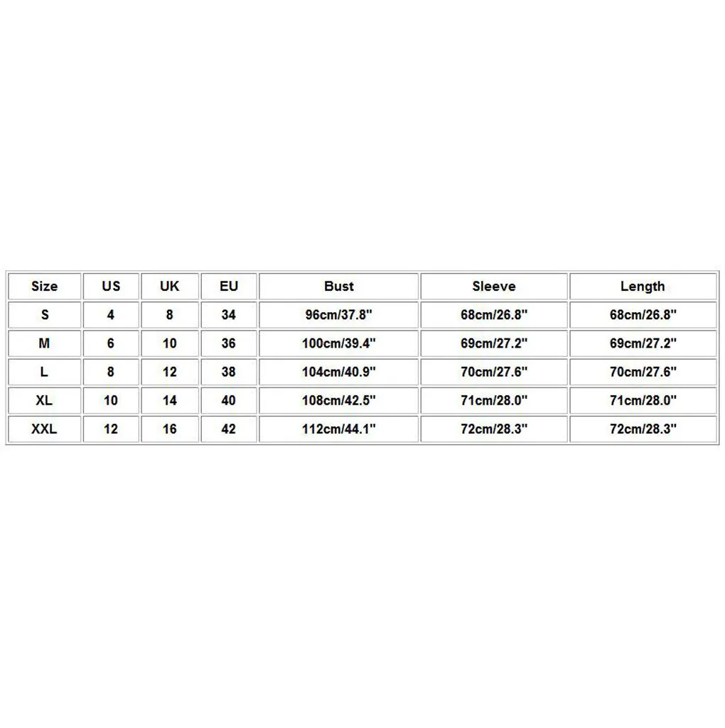 Размер США Великобритания ЕС Бюст Рукав Длина S 4. 8 34 96 см/37,8" 68 см/26,8" 68 см/26,8" М 6 10 36 100 см/39,4" 69 см/27,2" 69 см/27,2" L 8 12 38 104 см/40,9" 70 см/27,6" 70 см/27,6" XL 10 14 40 108 см/42,5" 71 см/28,0" 71 см/28,0" XXL 12 16 42 112 см/44,1" 72 см/28,3 дюйма 72 см/28,3 дюйма