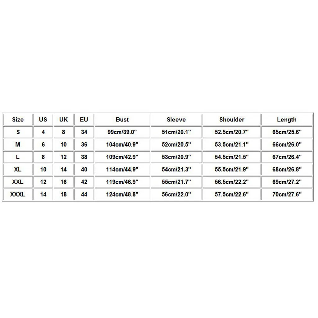 Размер США Великобритания ЕС Бюст Рукав Плечо Длина S 4. 8 34 99 см/39,0" 51 см/20,1" 52,5 см/20,7" 65 см/25,6" М 6 10 36 104 см/40,9" 52 см/20,5" 53,5 см/21,1" 66 см/26,0" L 8 12 38 109 см/42,9" 53 см/20,9" 54,5 см/21,5" 67 см/26,4 дюйма XL 10 14 40 114 см/44,9" 54 см/21,3" 55,5 см/21,9" 68 см/26,8" XXL 12 16 42 119 см/46,9" 55 см/21,7" 56,5 см/22,2" 69 см/27,2" XХХL 14 18 44 124 см/48,8" 56 см/22,0" 57,5 см/22,6" 70 см/27,6"