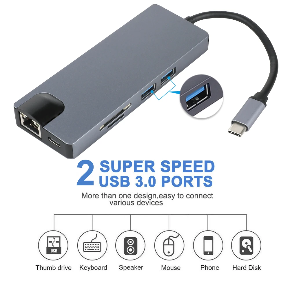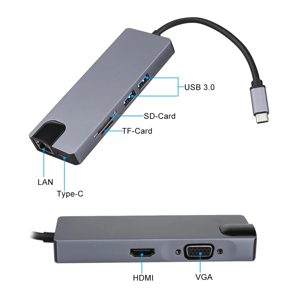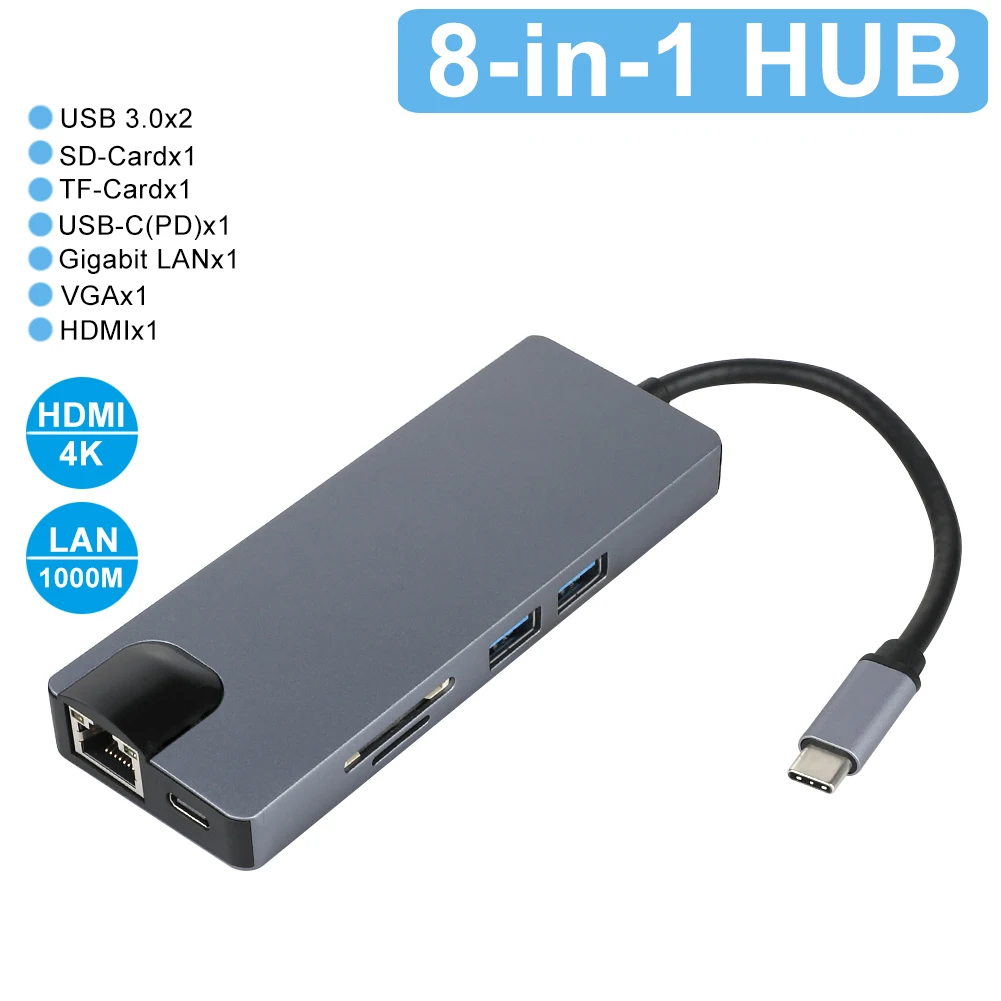 8 в 1: 2 * usb 3,0 + 1 * type-c + 1 * hdmi + 1 * lan + 1 * TF + 1 * SD + 1 * VGA