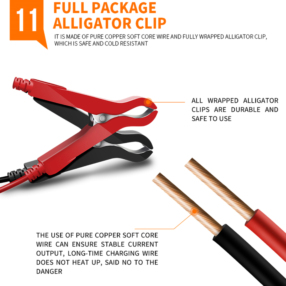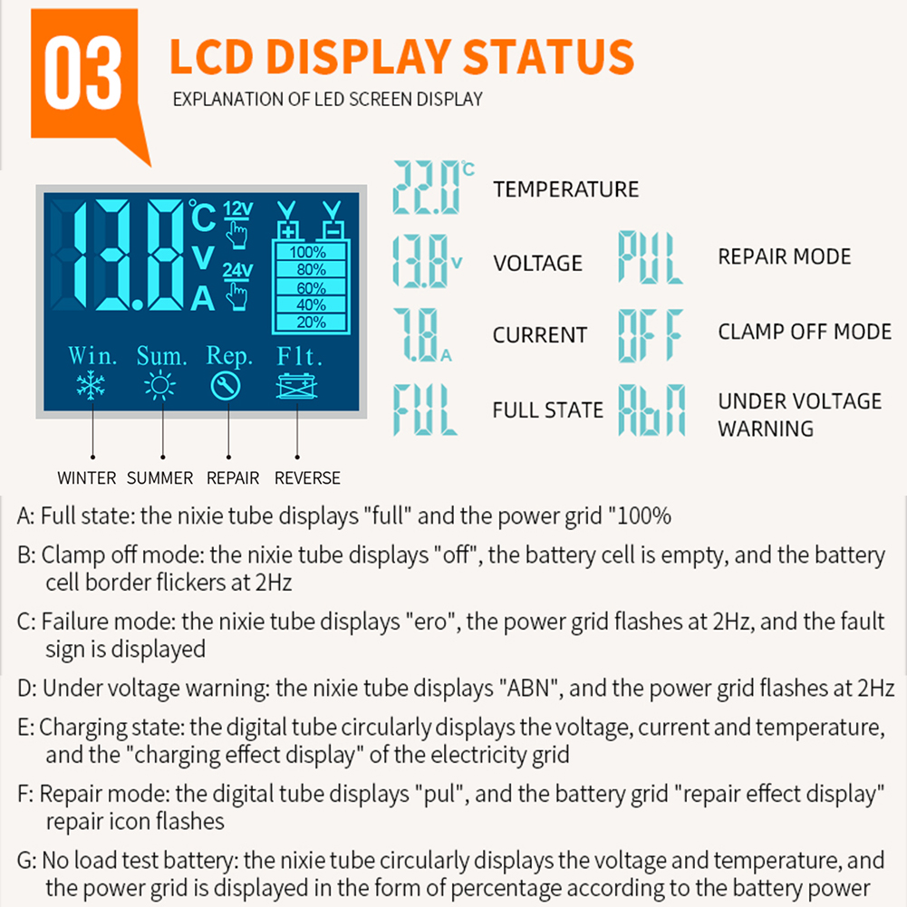 * 3. Зарядное устройство уровня 7 подходит для большинства типов аккумуляторов, включая литиевую батарею, 12В-24В 6аh-120ач свинцово-кислотные батареи (AGM, GEL, WET, SLA, DEEP CYCLE) для диагностики и устранения проблем и продления срока службы батареи. Они также могут помочь восстановить истощенные и сульфированные батареи.