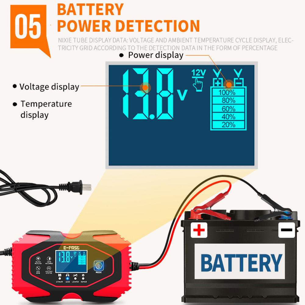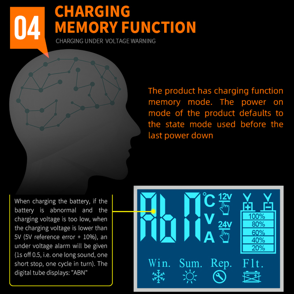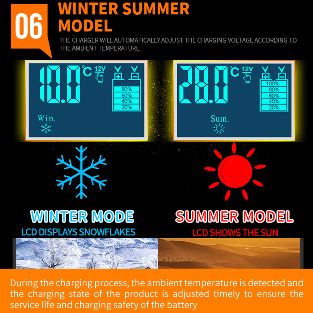 * 2. 【Интеллектуальный светодиодный цифровой дисплей 】 зарядное устройство автоматически определяет внешнюю температуру, автоматически запускает режимы зимы и лета и выбирает соответствующее напряжение зарядки в зависимости от температуры, без ручной регулировки. Автоматически останавливает зарядку при полной зарядке. Автоматический дисплей карусели данных показывает температуру, напряжение зарядки, зарядный ток и экран уровня заряда батареи.