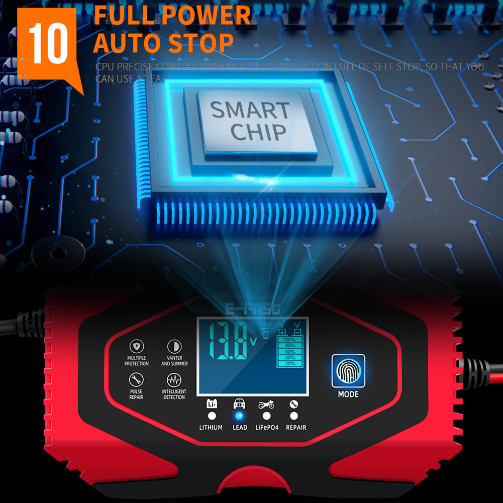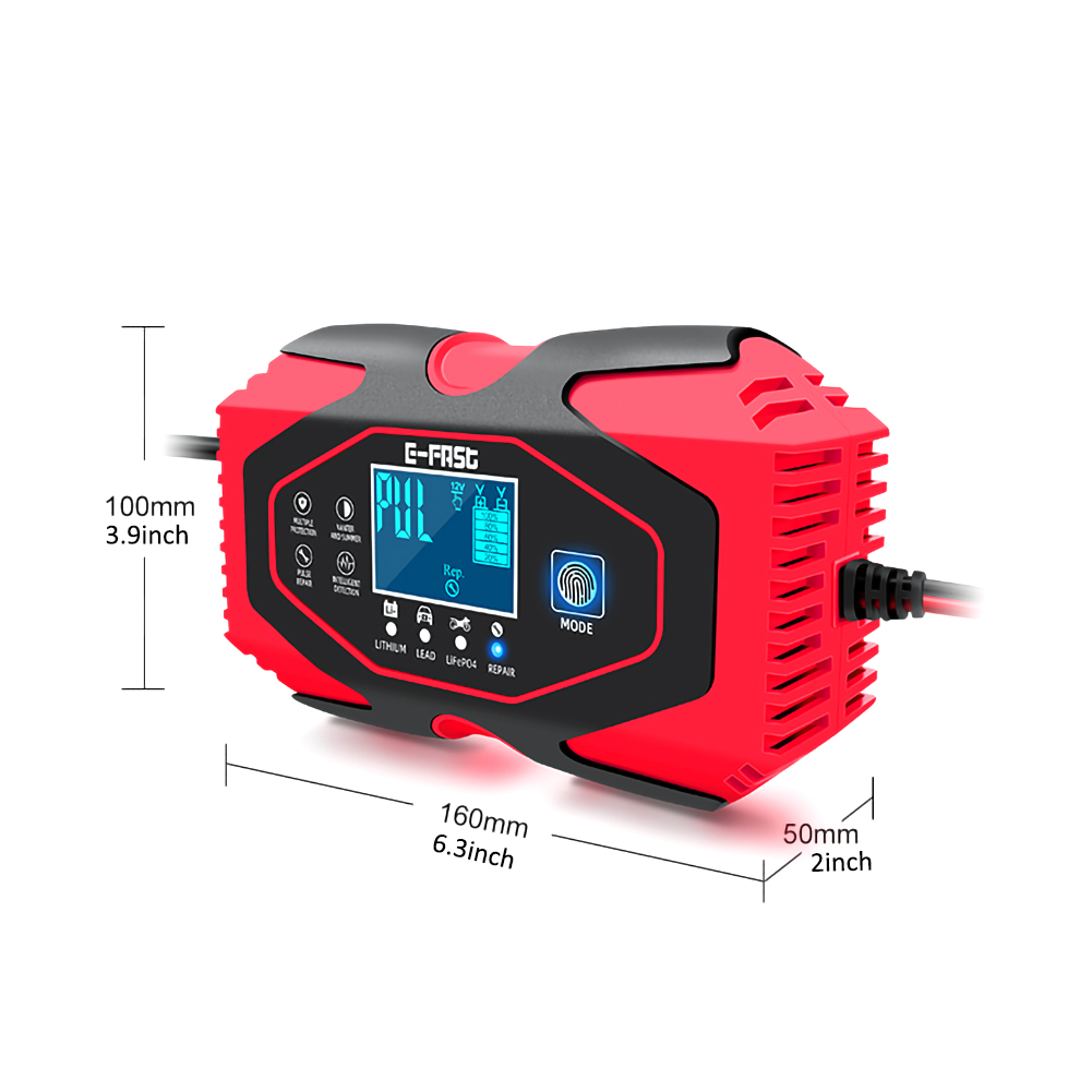 Автомобильное зарядное устройство предназначено для зарядки 12 В и 24 В литиевых, свинцово-кислотных, LiFePO4 батарей от 6AH-120AH(12 В),6AH-60Ah(24 В).