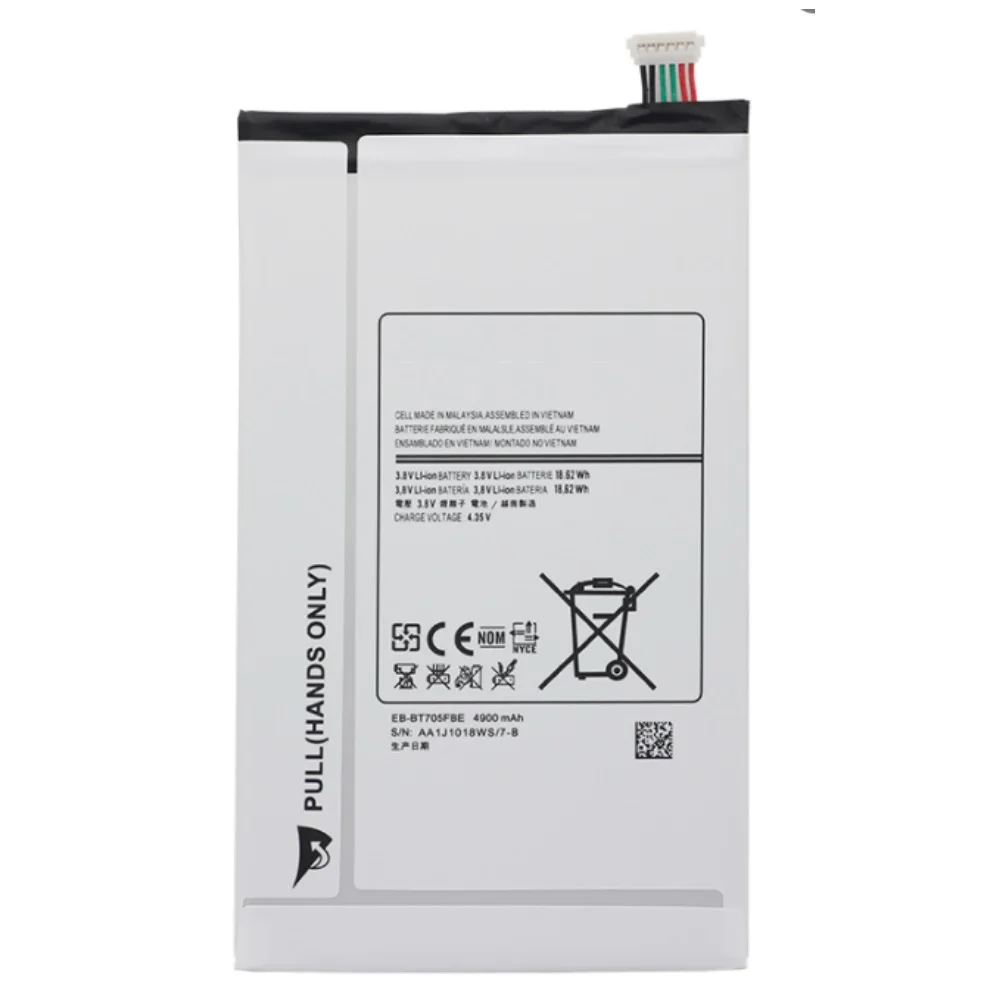 Описание АккумуляторEB-BT705FBE EB-BT705FBCдля Samsung GALAXY Tab S 8.4 T700 T705 SM-T700 T701Аккумулятор – запасная часть для смартфона. Батарея – компонент, который изнашивается чаще всего в мобильном аппарате. Аккумулятор имеет определенный ресурс, после продолжительной эксплуатации он теряет первоначальную емкость, уменьшается автономность смартфона.Батарея соответствует SamsungGALAXY Tab S 8.4 T700 T705 SM-T700 T701.Аккумулятор изготовлен сторонним производителем с соблюдением требований к качеству.По характеристикам он не уступает оригинальному изделию, полностью повторяет его. Батарея имеет соответствующие габариты и коннекторы, с ее подключением к устройству не возникнет проблем.Тип аккумулятора – литий-ионный. Он обеспечивает высокую надежность батареи, отсутствие эффекта памяти, продолжительный срок службы. Рабочее напряжение аккумулятора – 3.8 В. Его емкость соответствует стандартной – 4900 мА·ч.
