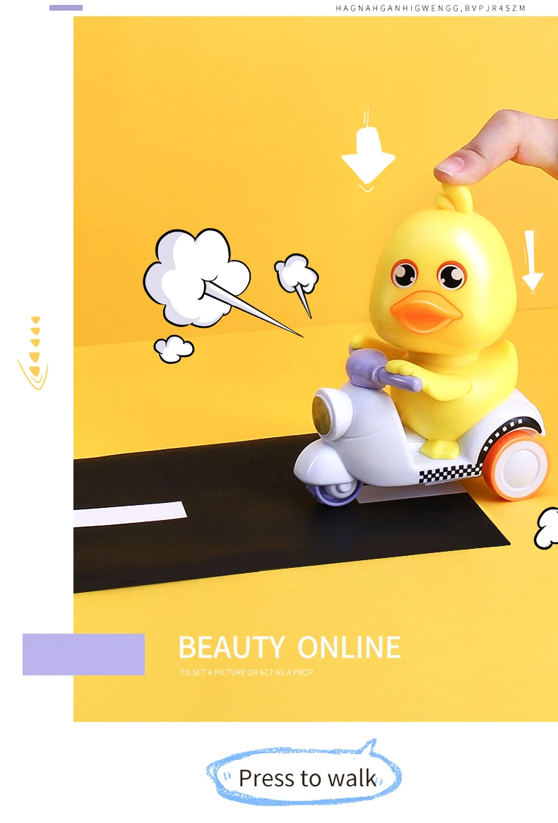 Головка Утки Может вращаться. Нажмите на голову. Мотоцикл может двигаться вперед. Очень интересно. Это подходящая игрушка для детей старше 3 лет. Яркие цвета. Прекрасная форма.