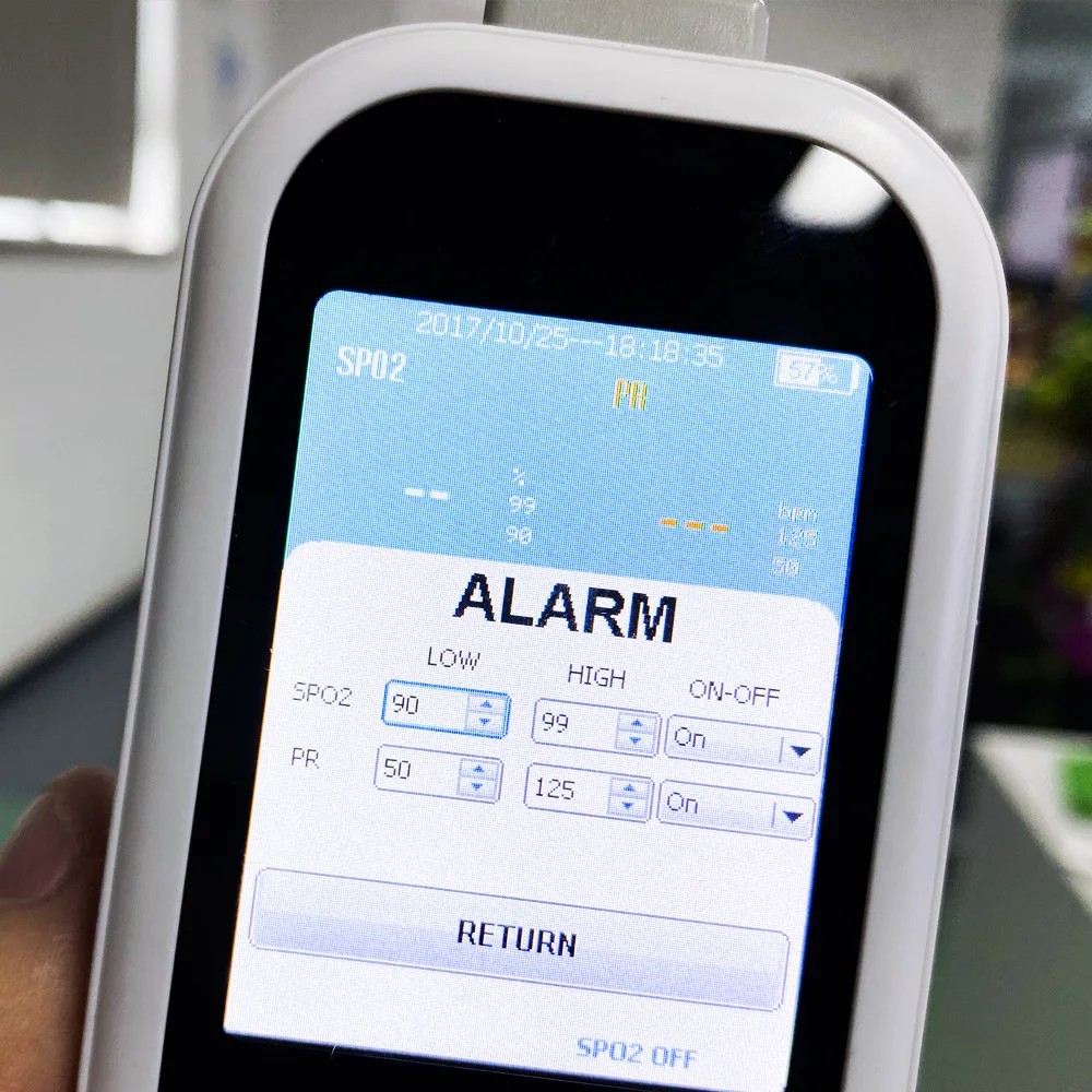 Время, яркость экрана, мониторинг за кулисами, верхний и нижний пределы SpO2. SPO2, PR громкость и Громкость будильника