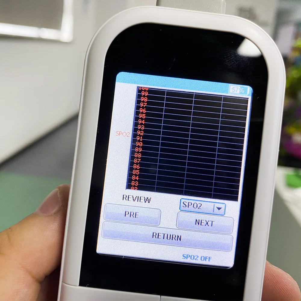 Может хранить последние 500 наборов данных, функция проверки может выбрать изменения в SpO2 или PR, функция trend может показать общие изменения данных в SpO2 и PR.
