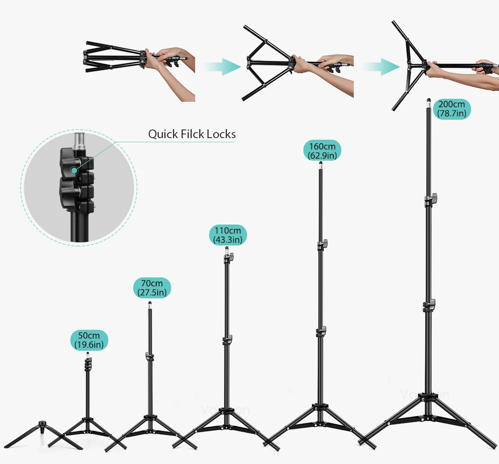 50 см/70 см/110 см/160 см/200 см Универсальный Высокий, и очень стабильный, вы можете открыть Телескопические ножки, легко изменить высоту штатива, подвижные подковы для любой географической среды