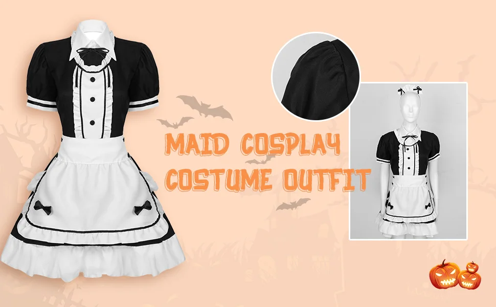 Классическое платье японской горничной, с круглым вырезом и короткими пышными рукавами, длиной до колена и трапециевидной формы, скрытая застежка-молния сбоку.