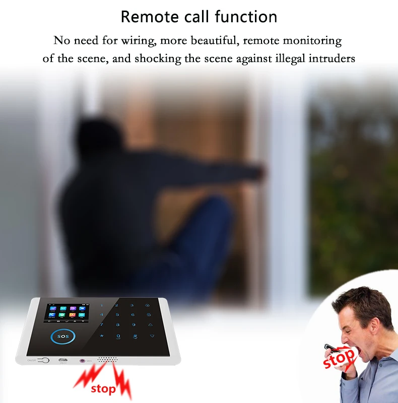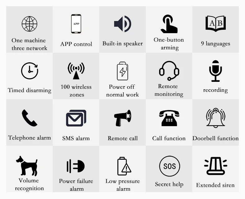 ● Управление сенсорной клавиатурой, WIF/GSM (2G), Поддержка IOS/Android ● Поддержка звуковых кнопок дверного звонка, dingdong, dingdong (по умолчанию) ● Секретная тревожная сигнализация SOS с одним ключом; Поддержка кода вызова, он может тайно набрать телефонный сигнал в аварийной ситуации (сигнал тревоги по умолчанию, можно установить); ● Поддержка произвольной настройки имени и номера главной двери, зала, помощи, спальни, окна, балкона, периметра, дыма, газа, окиси углерода, утечки воды, дверной звонок, PIR детектор, магнитный дверной детектор и т. Д.; ● Поддержка защиты параметры зоны, такие как на выход из зон обороны, что остались гвардии, дверной звонок, бесшумный обороны, 24-часовое испытание зон обороны; ● Поддержка нескольких расширенных дисплеев сигнализации и сигналов тревоги, таких как главный сбой питания, дефекты резервной батареи, антикражная сигнализация и т. д.; ● Двойной звуковой сигнал, встроенный динамик 120 дБ (по умолчанию), поддержка внешней звуковой сирены (опционально) ● Поддержка функции свободного оружия и обезвреживания ● Поддержка произвольного ввода номера зоны защиты;