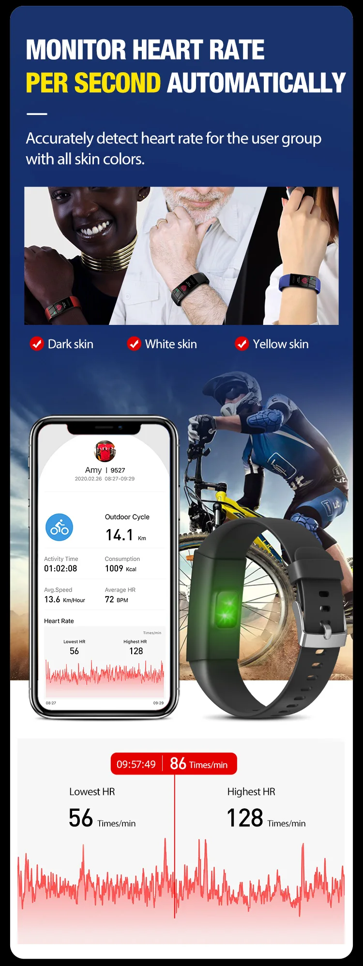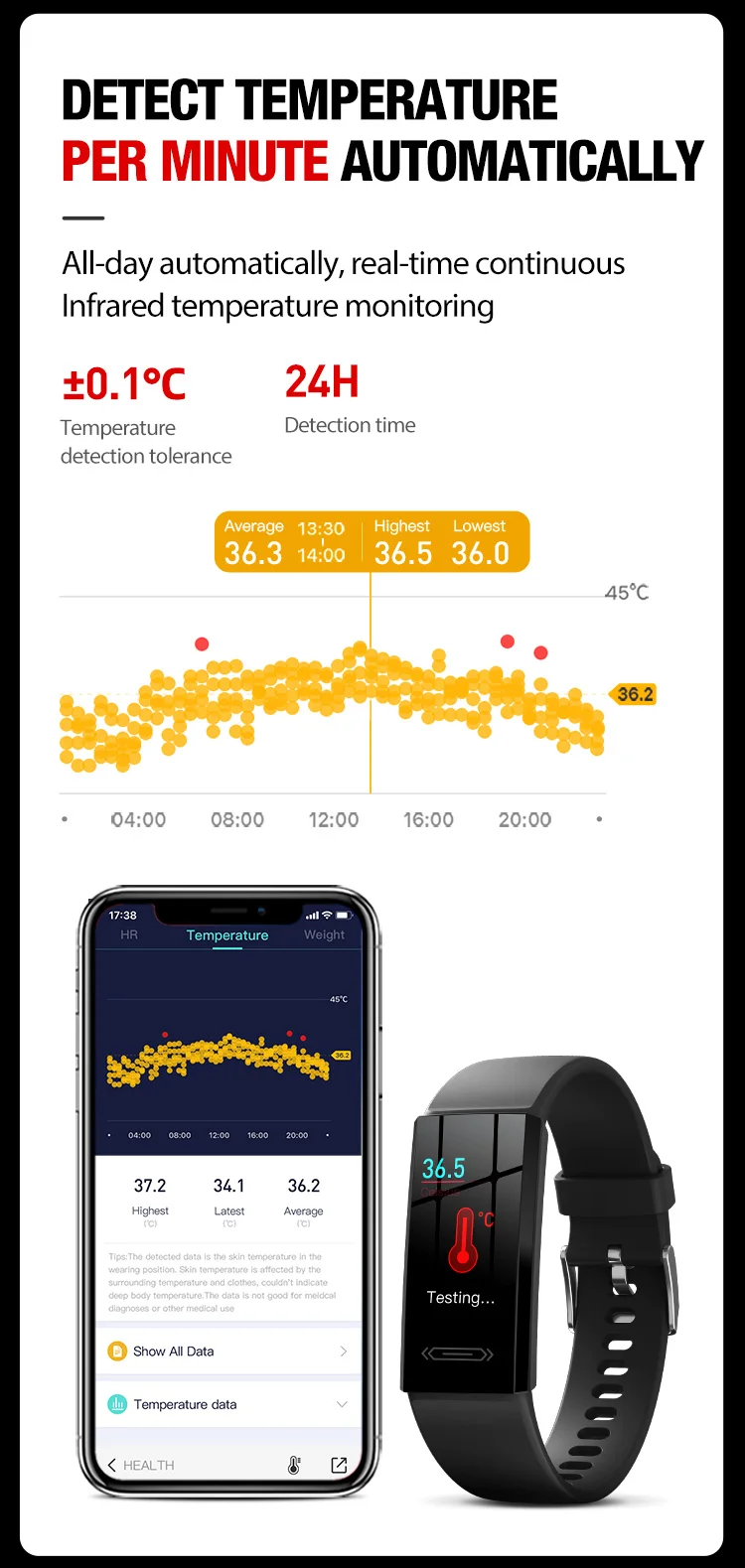 * 24 часа Непрерывное динамическое Обнаружение сердечного ритма, работоспособность на темной коже, белой коже, желтой коже. * Автоматический контроль температуры тела каждые минуты * Поддержка 5 спортивных режимов (открытый бег, Открытый Велоспорт, уличная ходьба, Крытый бег, бесплатное обучение, доска) * Фитнес-трекер и советы по здоровью: шаги, калории, расстояние * Интеллектуальная запись сна и монитор * Напоминание о звонках, SMS/SNS сообщение push (в том числе * wechat,qq,facebook,whatsapp, линия, электронная почта и т. Д.) * Отключение звука/Отклонение входящего вызова, последние 10 сообщений в магазине. * Будильник, бесшумный будильник * Найти устройство, не беспокоить режим * Удаленная фотография вращается на запястье * Поднимите запястье, чтобы осветить экран * Установка цели * Синхронизация данных с приложением * Оборотень, обратный отсчет, секундомер * Функциональный переключатель (частота сердечных сокращений, температура тела, автоматический мониторинг
